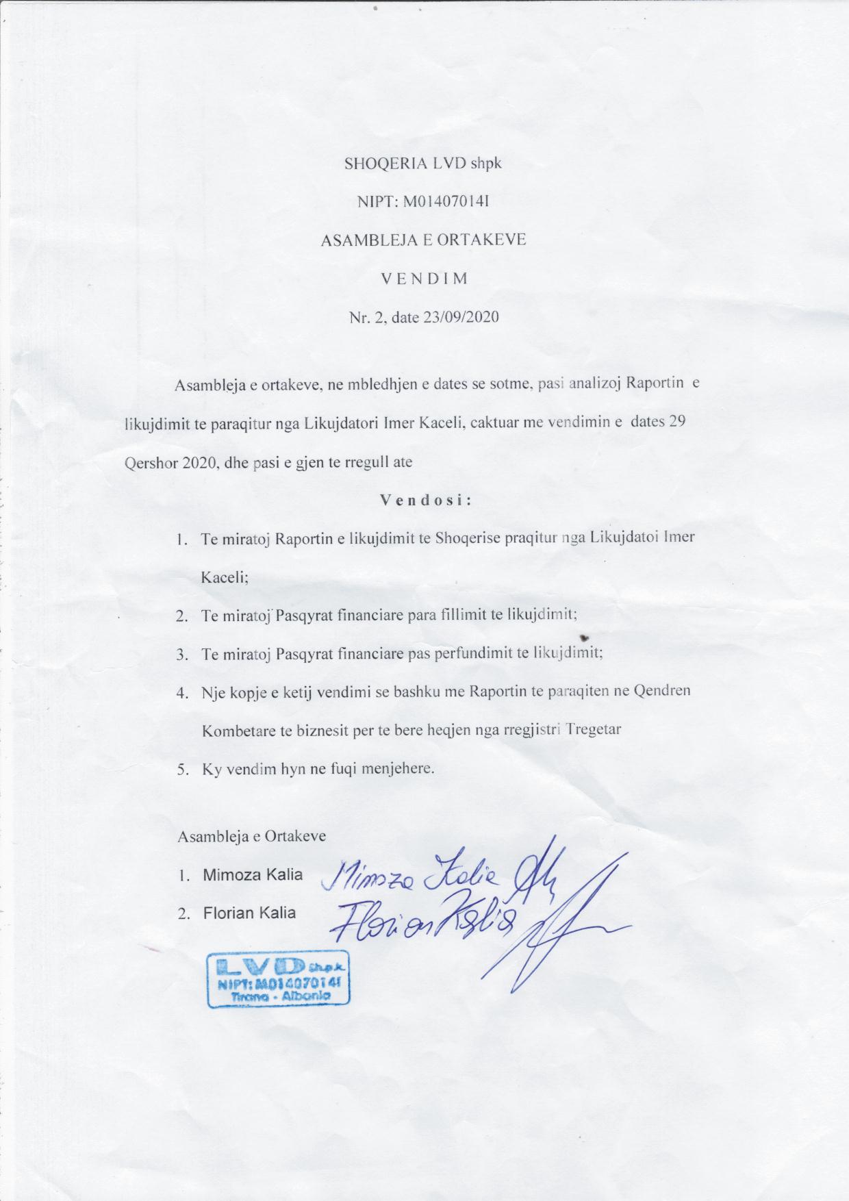 | Çështje Ligjore: | I.Sipas vendimit te asamblese se pergjithshme date 16.08.2020 ka ndodhur ndryshimi i statusit nga "Aktiv" ne "Shoqeri ne Likuidim e Siper". II.Sipas vendimit te asamblese se pergjithshme date 23.09.2020 ka ndodhur ndryshimi i statusit nga "Shoqeri ne Likuidim e Siper" ne "Çregjistruar". |