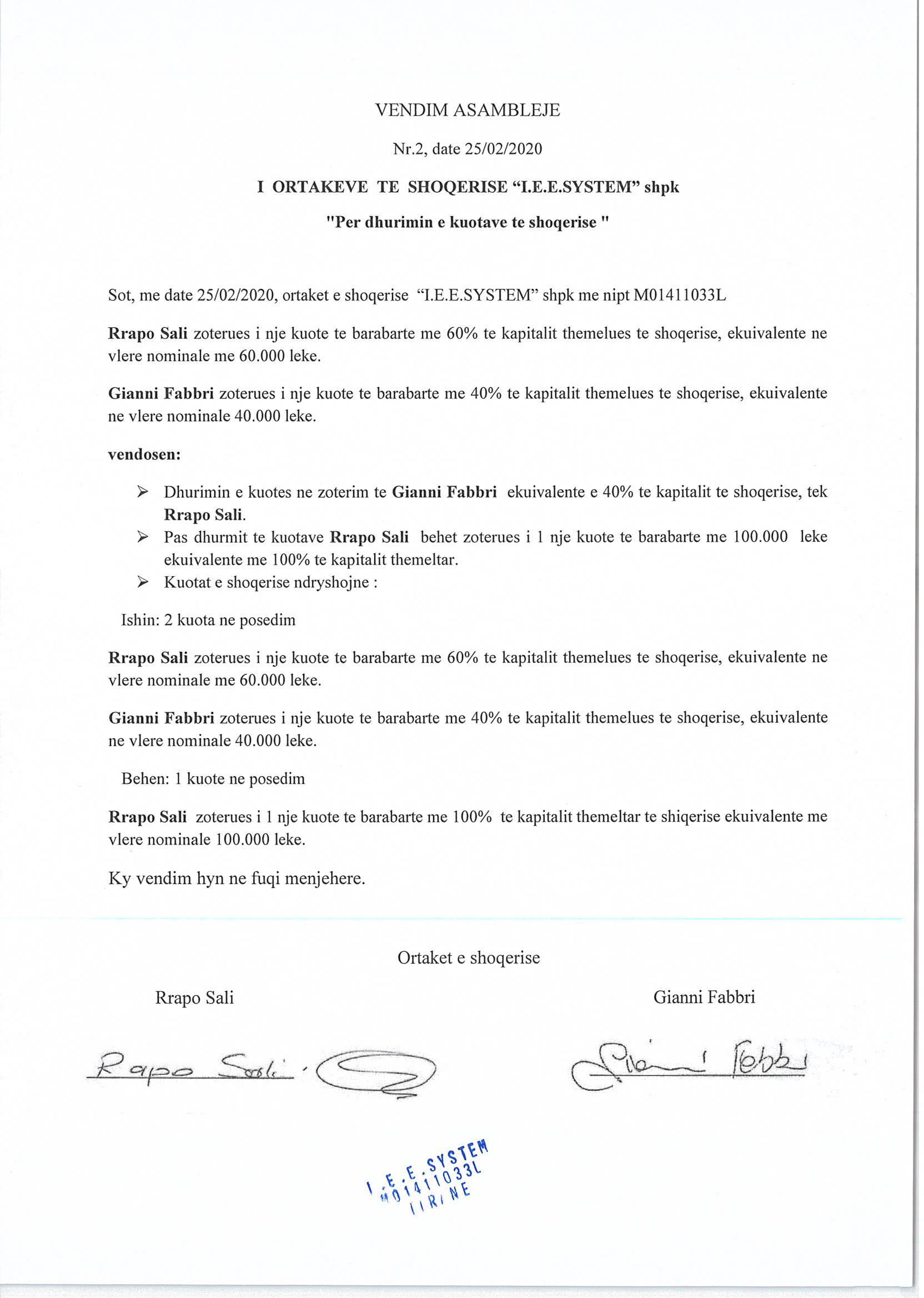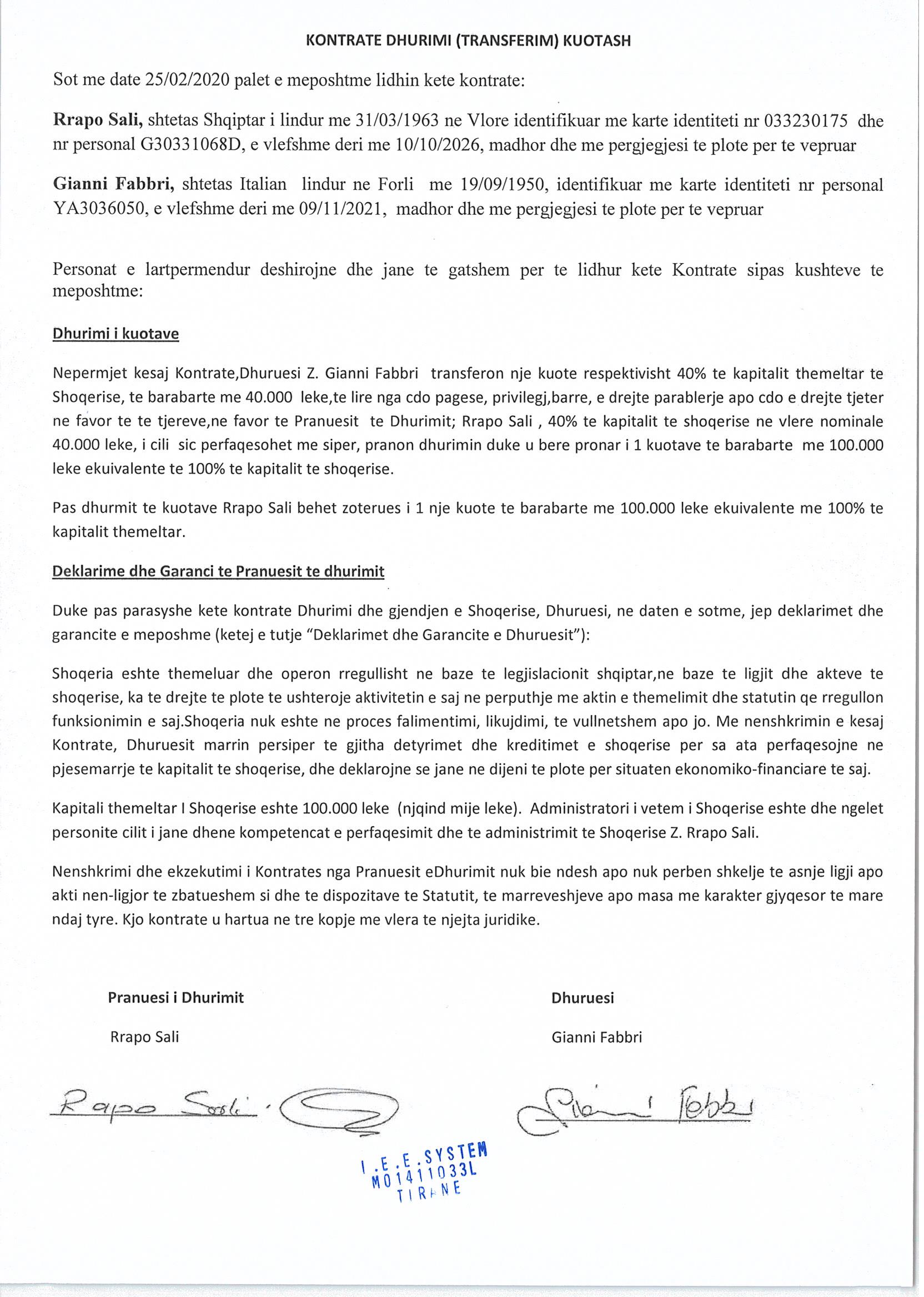 → Ekstrakti Historik i Regjistrit Tregtar date 20.04.2022 → Statuti i Shoqerise → Vendim i Asamblese se Pergjithshme date 25.02.2020 → Kontrate e Dhurimit te Kuotave date 25.02.2020 → Vendim i Asamblese se Pergjithshme date 26.07.2021 |