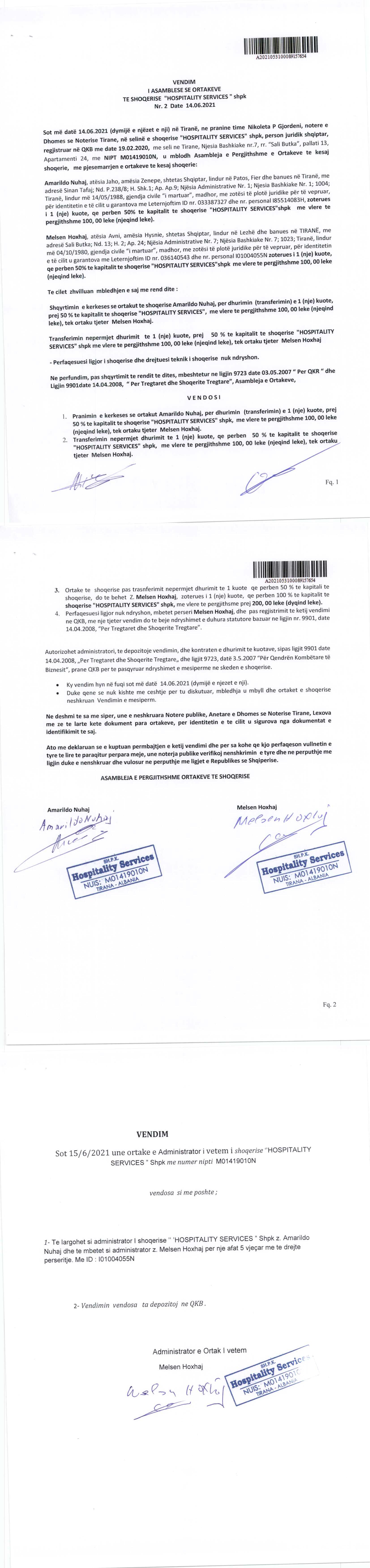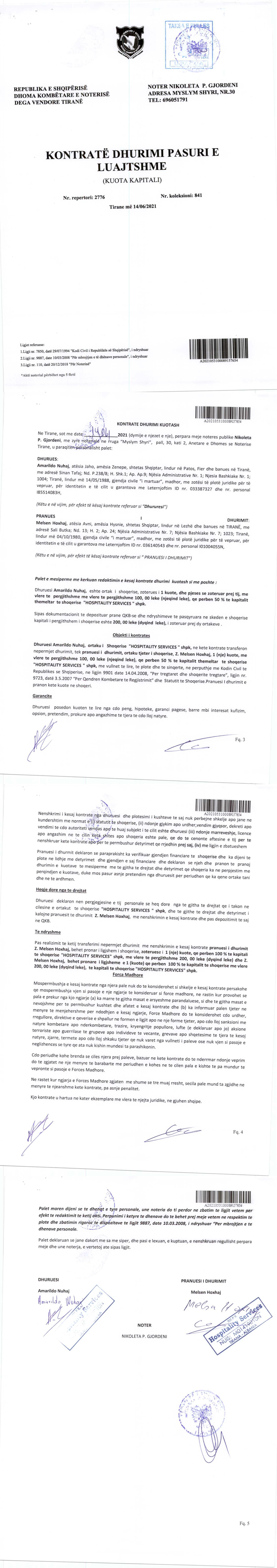 → Ekstrakti Historik i Regjistrit Tregtar date 27.04.2022 → Statuti i Shoqerise → Vendim i Asamblese se Pergjithshme date 08.03.2021 → Vendim i Asamblese se Pergjithshme date 14.06.2021 → Kontrate e Dhurimit te Kuotave date 14.06.2021 |