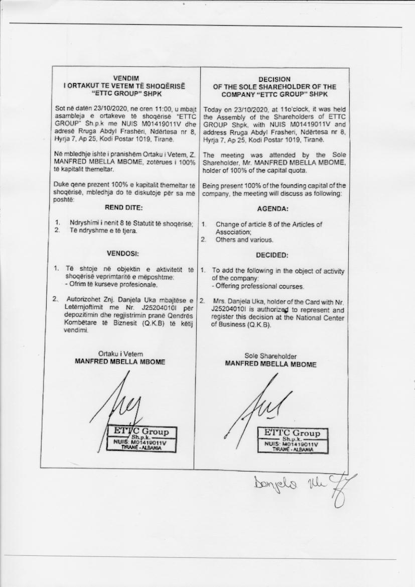 | Objekti i Veprimtarisë: | Konsulence mbi edukimin. Ofrim te kurseve profesionale. |