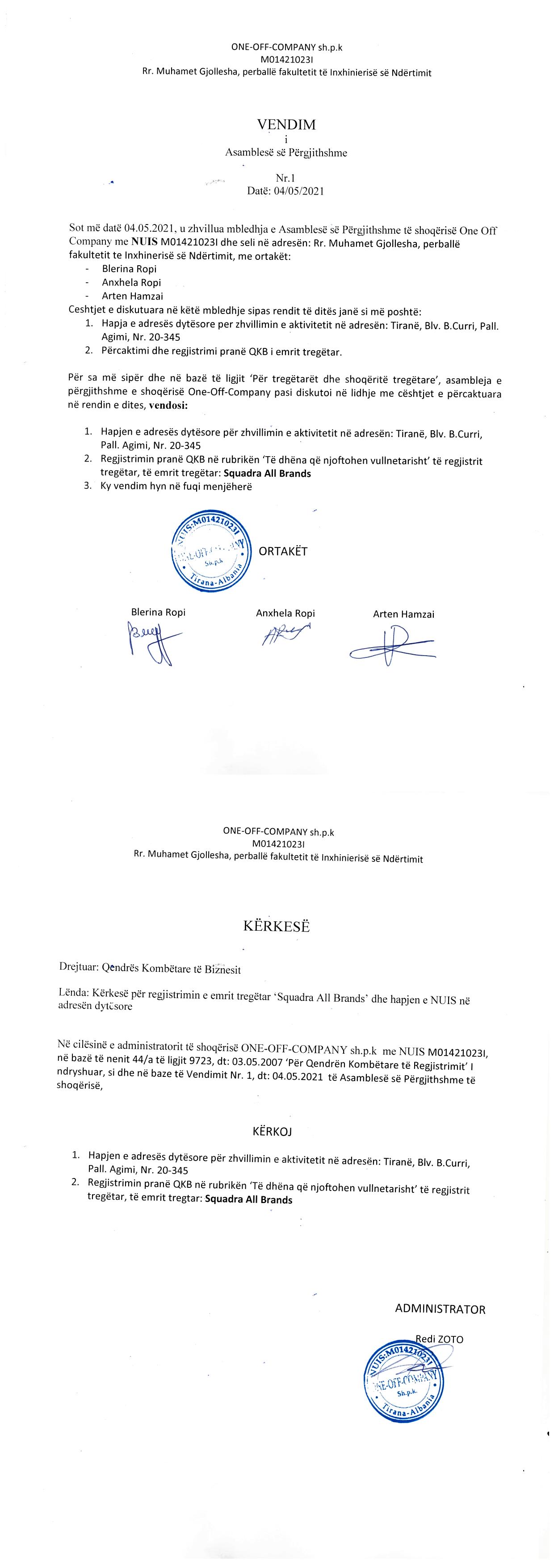 → Ekstrakti Historik i Regjistrit Tregtar date 27.04.2022 → Akt themelimi i Shoqerise → Vendim i Asamblese se Pergjithshme date 04.05.2021 → Vendim i Asamblese se Pergjithshme date 09.10.2021 → Kontrate e Shitjes se Kuotave date09.10.2021 |