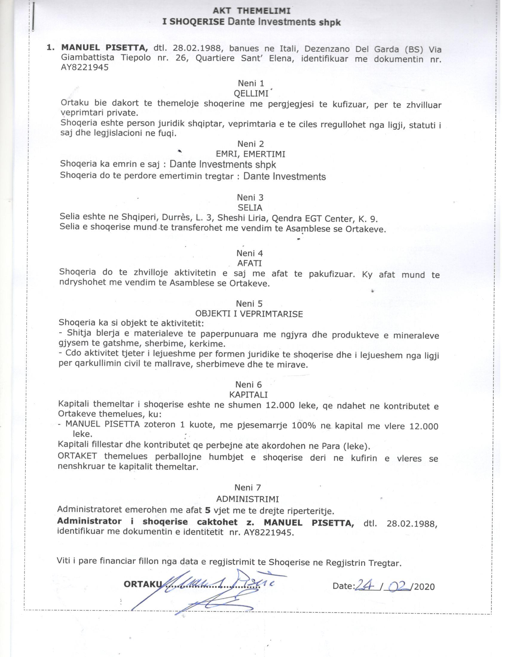 | Emërtime të tjera Tregtare: | Dante Investments |