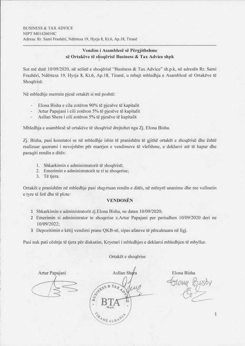 → Ekstrakti Historik i Regjistrit Tregtar date 28.04.2022 → Akt themelimi dhe Statuti i Shoqerise → Vendim i Asamblese se Pergjithshme date 10.09.2020 → Vendim i Asamblese se Pergjithshme date 01.09.2021 → Kontrate e Shitjes se Kuotave date 01.09.2021 → Vendim i Asamblese se Pergjithshme date 29.10.2021 |
