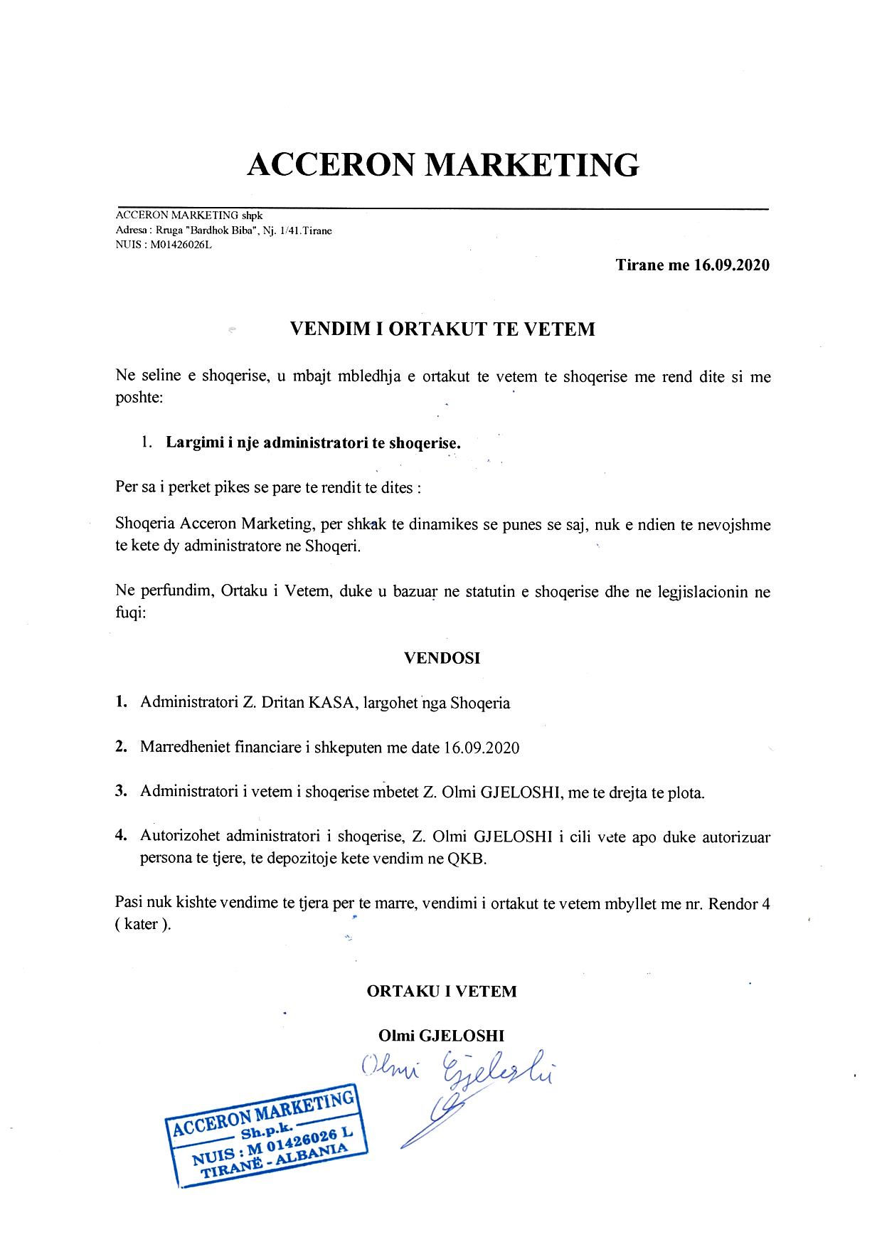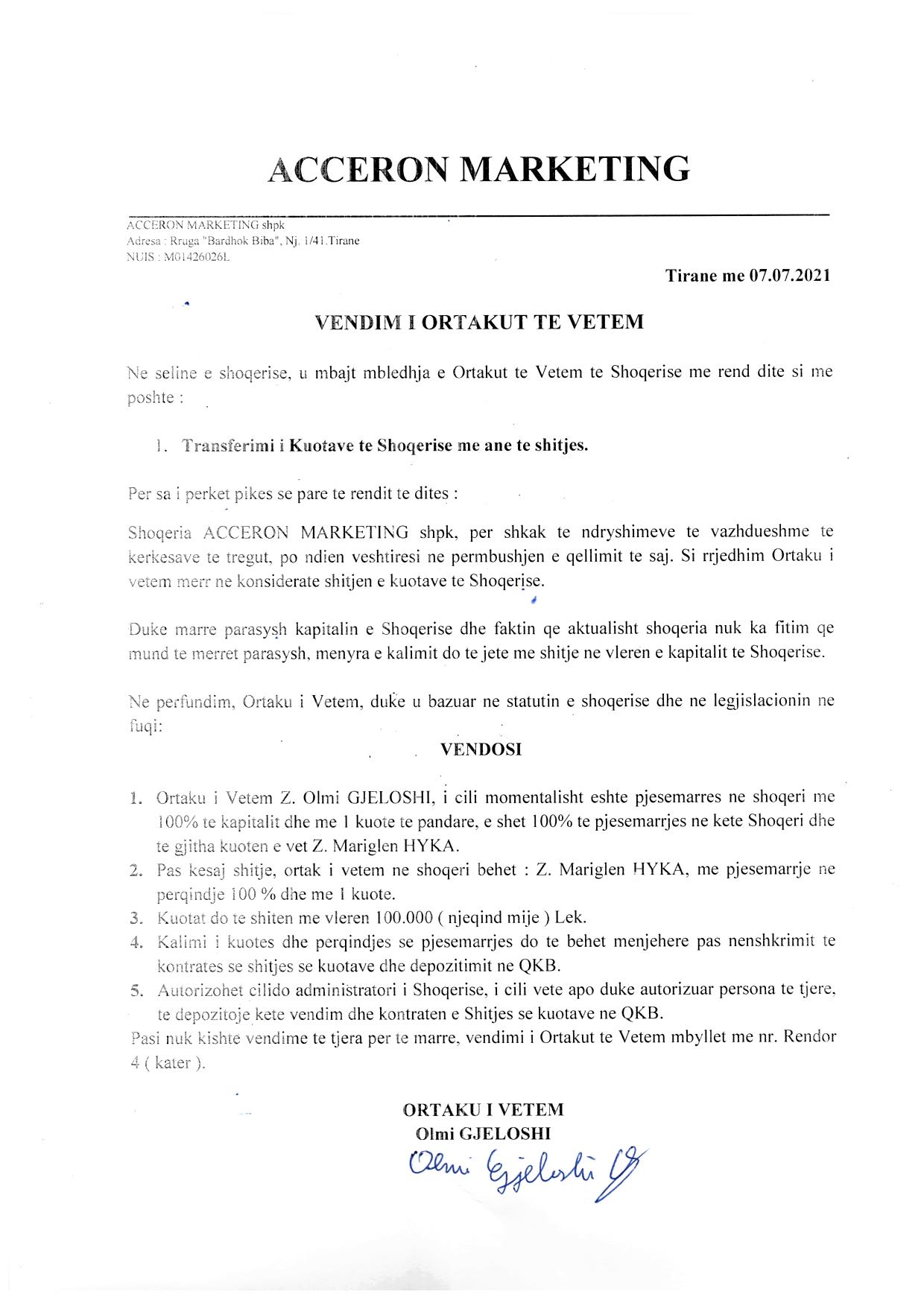 → Ekstrakti Historik i Regjistrit Tregtar date 28.04.2022 → Akt themelimi dhe Statuti i Shoqerise → Vendim i Asamblese se Pergjithshme date 25.08.2020 → Kontrate e Dhurimit te Kuotave date 25.08.2020 → Vendim i Asamblese se Pergjithshme date 16.09.2020 → Vendim i Asamblese se Pergjithshme date 07.07.2021 → Kontrate e Shitjes se Kuotave date 07.07.2021 → Vendim i Asamblese se Pergjithshme date 27.07.2021 |