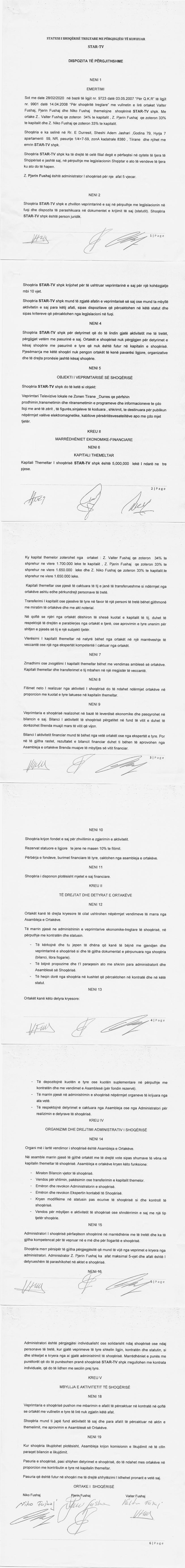 | Objekti i Veprimtarisë: | Veprimtari televizive lokale ne Zonen Tirane Durres qe perfshin prodhimin, transmetimin dhe ritransmetimin e programeve dhe informacioneve te çdo lloji me ane te zerit, te figures, sinjaleve te koduara, shkrimit, te destinuara per publikun nepermjet valeve elektromagnetike, kabllove perseriteseve sateliteve apo me çdo mjet tjeter. |