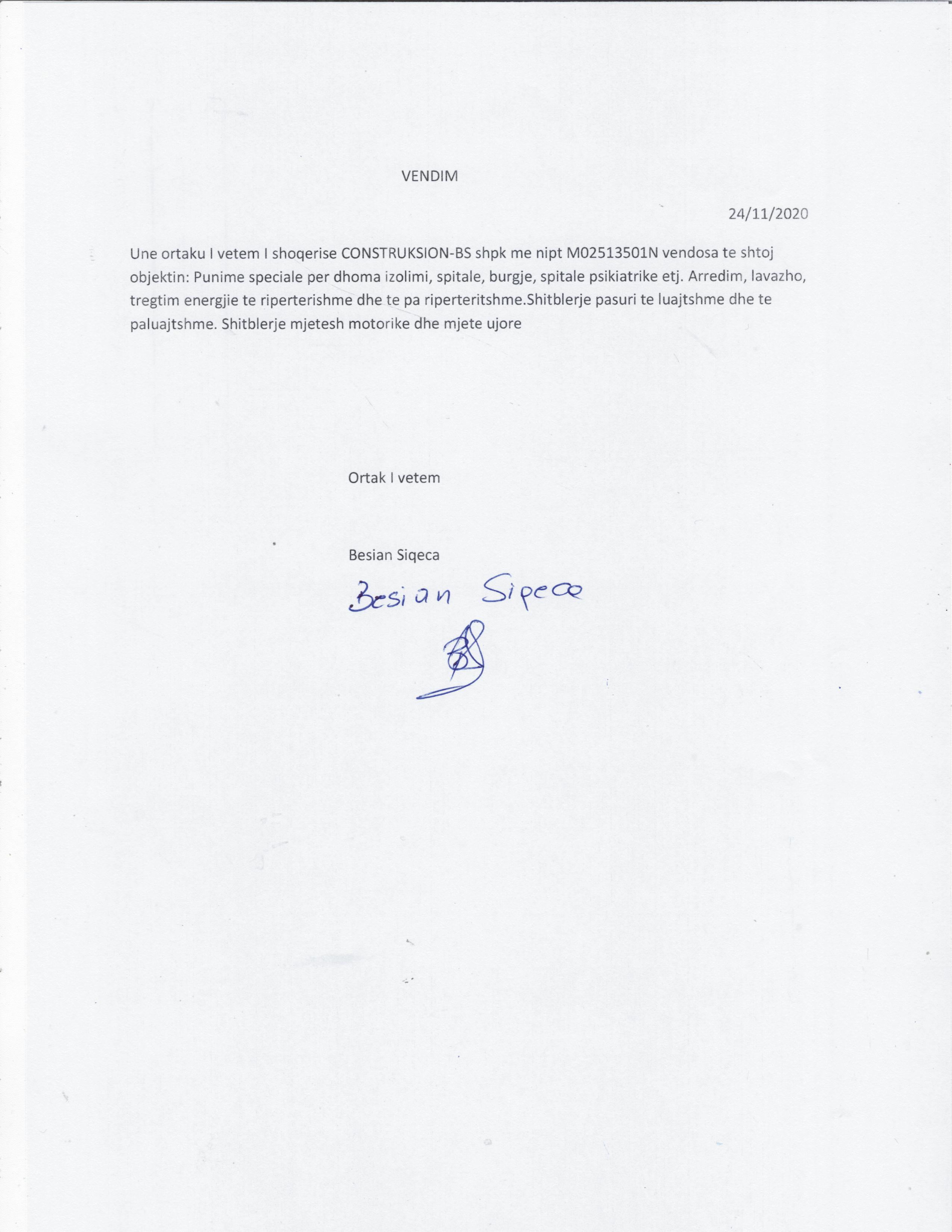 | Objekti i Veprimtarisë: | Aktivitet në fushën e ndërtimit: ndërtime gërmime dheu me punime eventuale muraturë e beton arme, prishje dhe punime në tokë të gërmuar.Ndërtime civile dhe ekonomike, rrugë, hekurudha, ura vepra arti, ndërtime detare, hidraulike,hidroteknike, vepra të vecanta e punime speciale, punime restaurimi, karpentierie, impiante teknologjike dhe të vecanta, punime shërbimi, punime të sinjalizimit rrugor.Projektim, rikonstruksion vepra arti të vogla.Prodhime material ndërtimi. Shitje blerje të objekteve të ndërtuara dhe shpërndarja e cdo lloj shërbimi me klientë e furniturë të lidhur me shoqërinë. Import -eksport dhe shitjen e tyre me pakicë dhe shumicë të mallrave të ndryshëm industrialë, ushqimorë, elektroshtëpiakë, materiale ndërtimi,lëndë të para për ndërtim, materiale inerte, bojra, materiale hidraulike, elektrike, lëndë drusore, pjesë këmbimi,makineri, konfeksione etj Blerje pjesë këmbimi për makina dhe makineri të ndryshme. Pastrime mirëmbajtjeje. Servis mjetesh. Blerje kancelarie, tonerash, detergjentësh. Punime shërbimi në institucionet shtetërore dhe private ku përfshihen, pastrime, recepsion, hedhje formular, riparime në objekte zyra, furnizime hidrosanitare, elektrike, pajisje zyrë mobileri, shërbime lyerje me bojë dhe gëlqere, blerje material druri, hekuri dhe nënprodukte të tij, vegla pune,sinjalistik, montim dhe çmontim skelash. Furnizime dhe tregtime lëndë djegëse, naftë, pellet, gaz dhe nënprodukte druri dhe të tjera. Servise mjetesh motorrike shtetërore dhe te lëvizshme të të gjitha tonazheve( vetura, kamiona,ekskavatora, autobuza etj.) dhe pjesët përbërëse si goma, bateri, pjesë motorrike xhenerike, hidraulike, vajra etj. Shërbime furnizimi në fushën e kaldajave, ngrohje, ftohje,kondicionimit të ambjenteve. Punime trajtimi dhe sistemimi në fushat e teknologjisë, bujqesisë, industrisë, infrastrukturës, mjedisit, telekomunikacion elektronik, hidroteknik, impjante mbeturinash, gjelbërimi, pyje, shëndetsi, hoteleri, turizëm, biznese të ndryshme, ujësjellsa, gazësjellesa, kanalizime, definfektime, dezifektime deratizime. Shërbim transporti. Guida turistike. Akomodim hoteleri. Me zgjerimin e aktivitetit shoqëria shpk mund të bëjë ndryshime të objektit të veprimtarisë së saj, duke bërë ndryshimet përkatëse në statutin e shoqërisë. Punime speciale per dhoma izolimi, spitale, burgje, spitale psikiatrike etj. Arredim, lavazho, tregtim energjie te riperterishme dhe te pa riperteritshme.Shitblerje pasuri te luajtshme dhe te paluajtshme. Shitblerje mjetesh motorike dhe mjete ujore |
