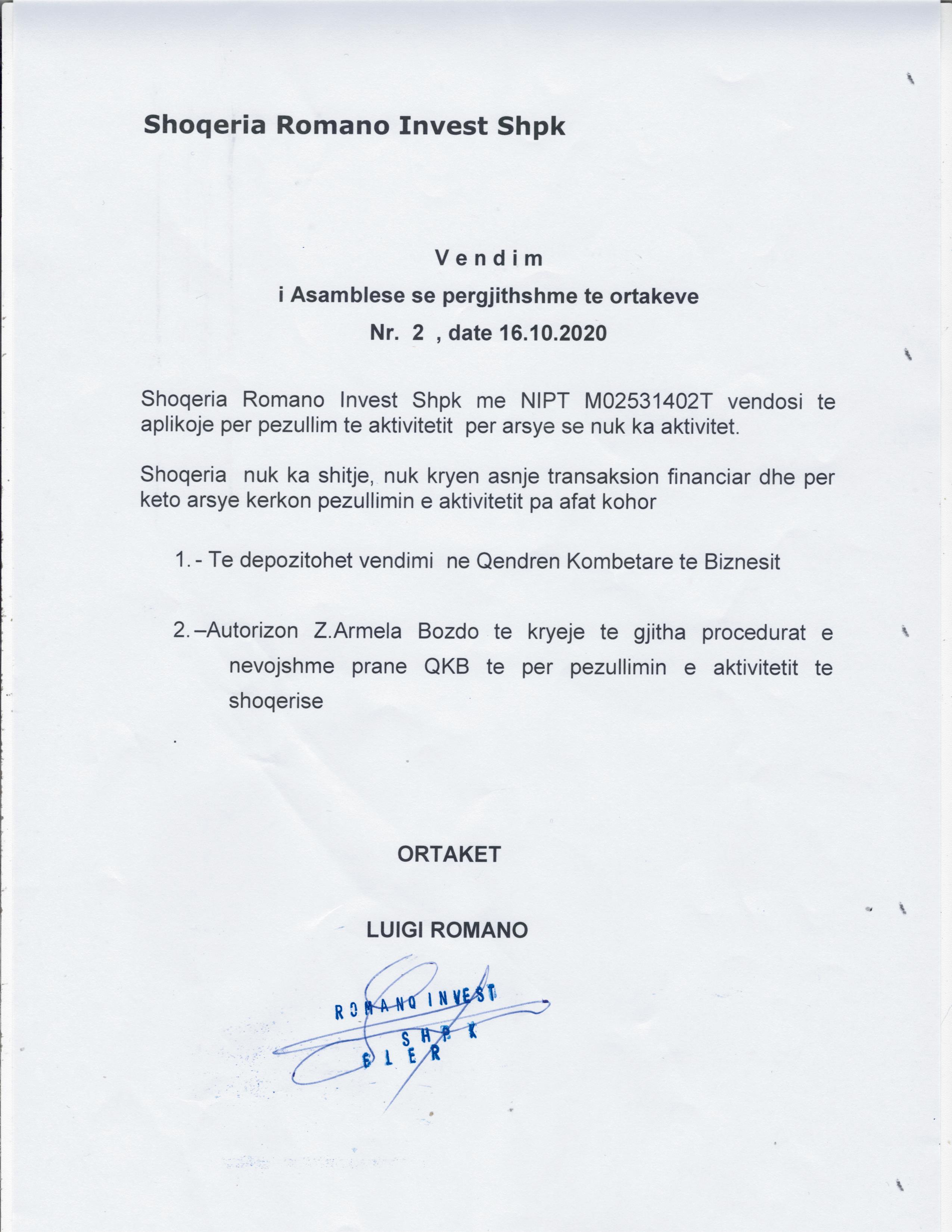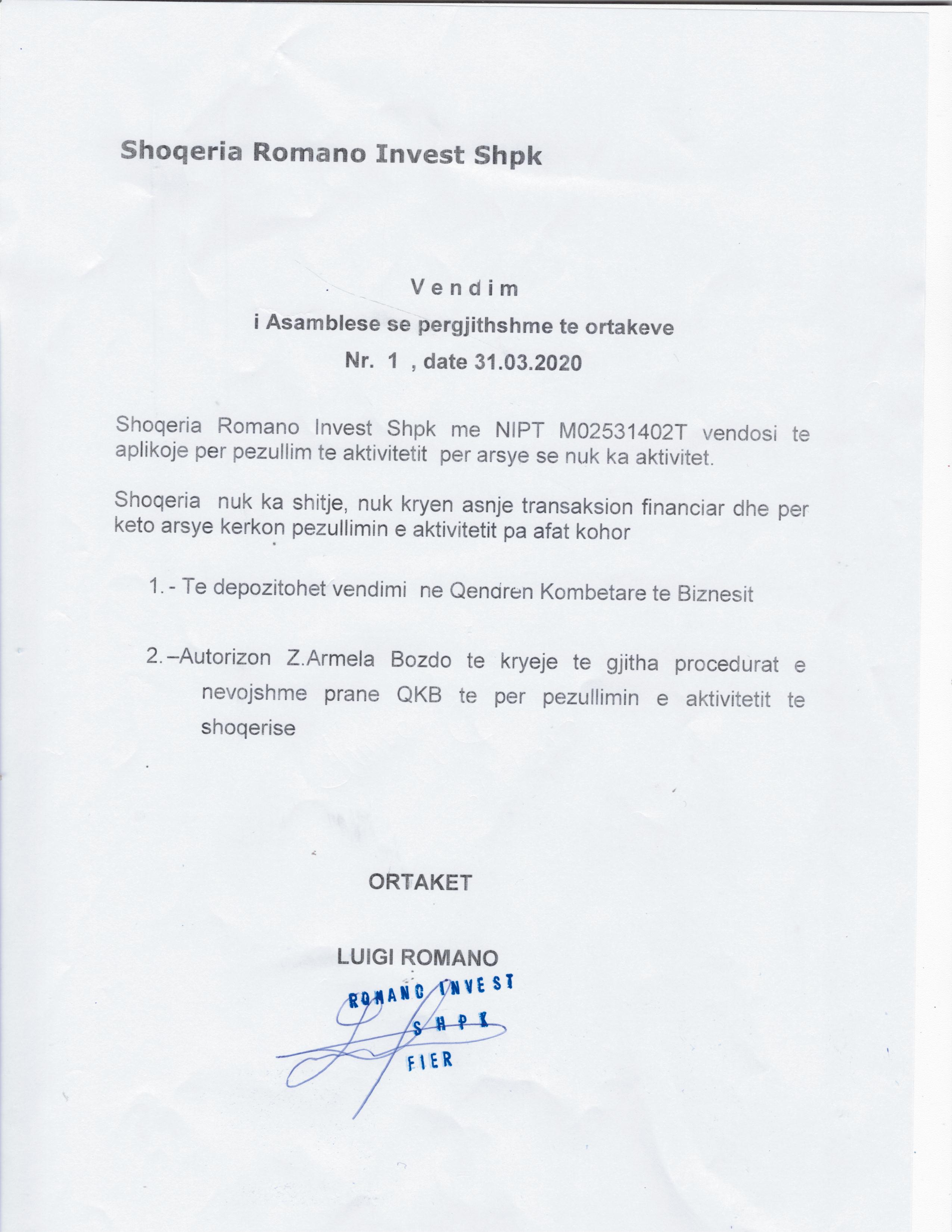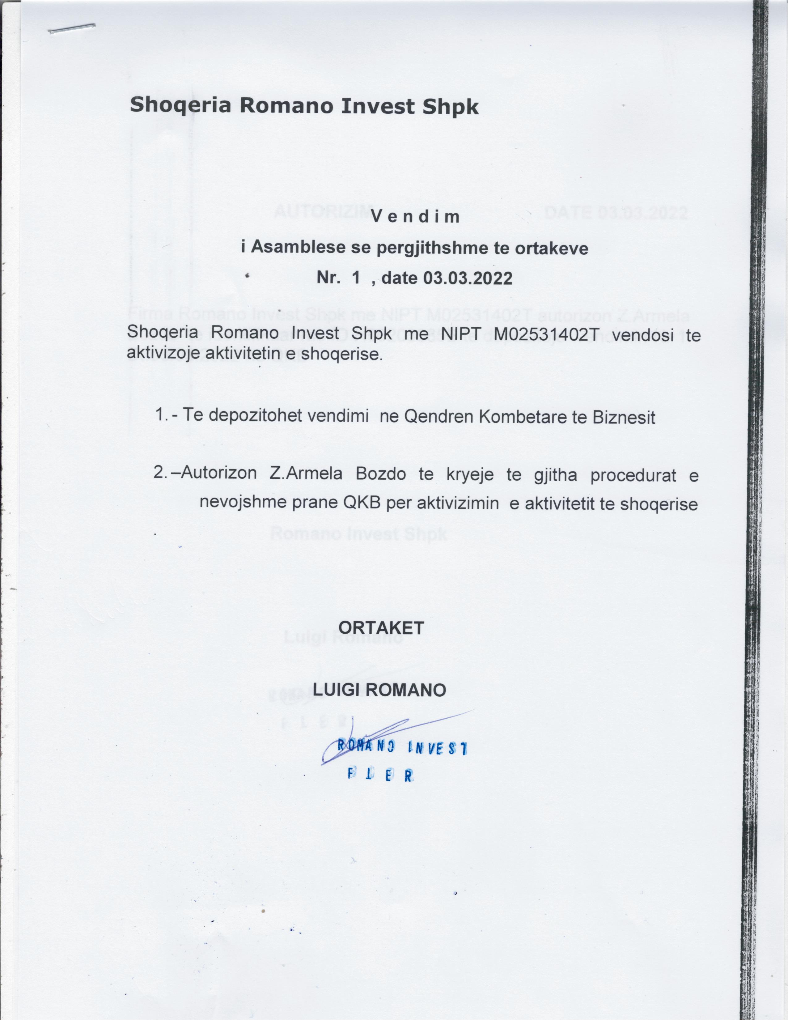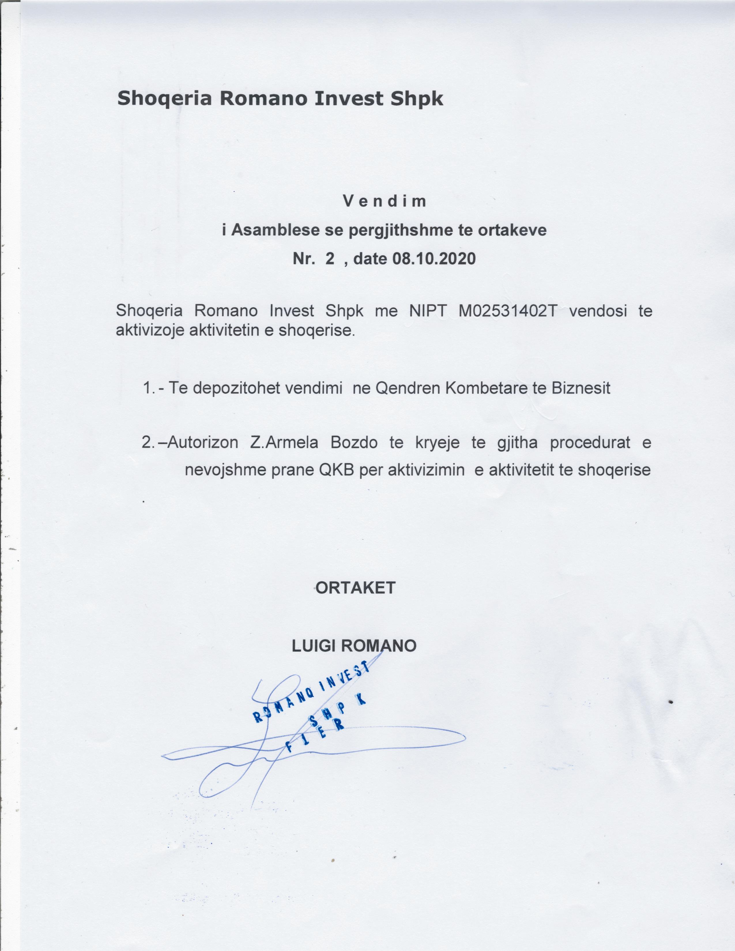 → Ekstrakti Historik i Regjistrit Tregtar date 07.04.2022 → Akt themelimi i Shoqerise → Vendimi i asamblese se pergjithshme date 31.03.2020 → Vendimi i asamblese se pergjithshme date 08.10.2020 → Vendimi i asamblese se pergjithshme date 16.10.2020 → Vendimi i asamblese se pergjithshme date 03.03.2022 |