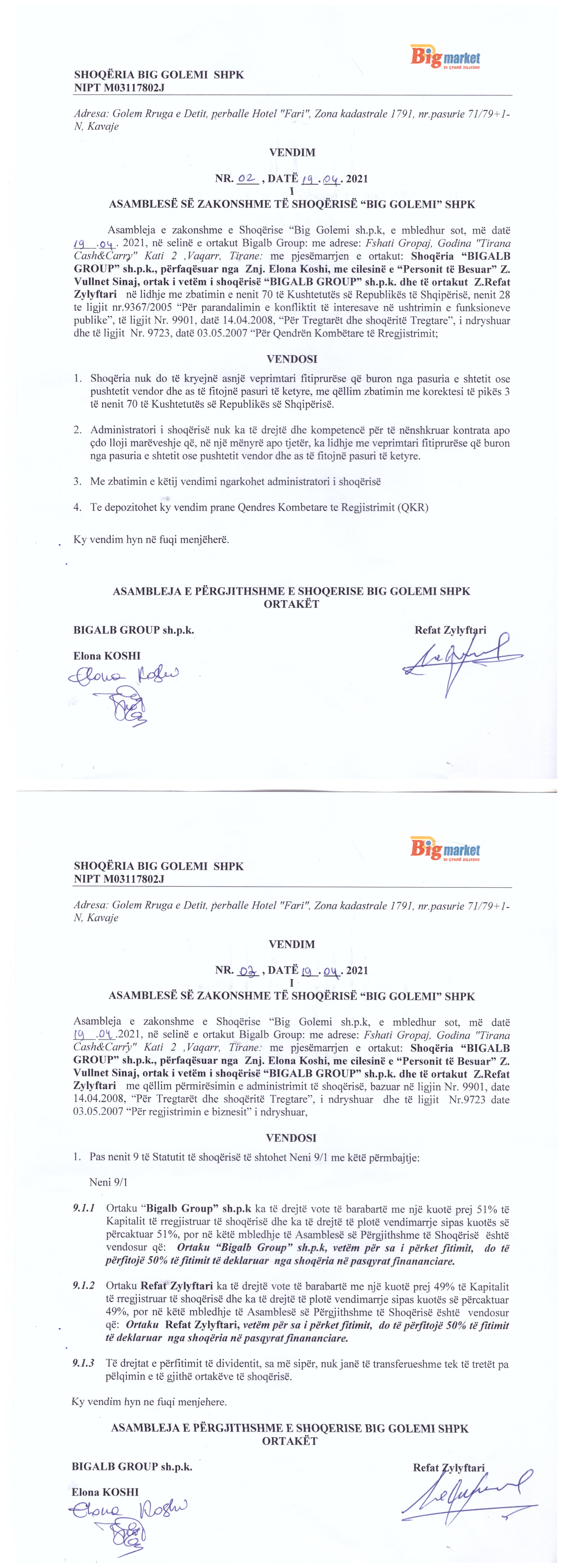 | Shoqëri Mëmë / Zotërues për këtë Subjekt: | “BIGALB GROUP”, shoqëri me përgjegjësi të kufizuar, e themeluar më datë 17/03/2011, sipas ligjeve të Republikës së Shqipërisë, me numër identifikimi në regjistrin tregtar NIPT L11521002M, me adresë në aktuale në Tirane Vaqarr GROPAJ Fshati Gropaj, Godina Tirana Cash & Carry, Kati 2, Vaqarr, dhe me administrator Elona Koshi. Ortak i vetëm i shoqërisë është Vullnet Sinaj (zoterues pasiv), zotërues për 100% të kapitalit. (Sipas të dhënave të QKB deri më datë 14.08.2024) Sipas Ekstraktit Historik te Regjistrit te Pronarit Perfitues, depozituar në QKB date 20.03.2021, terhequr datë 14.08.2024, Pronaret perfitues te subjektit “BIG GOLEMI”, zoterues te 25% te kapitalit e me teper, janë: Vullnet Sinaj, shtetas shqiptar, i datelindjes 1965, pronar perfitues per 51% te pronesise pasi zoteron 100% te kapitalit të “BIGALB GROUP” shpk – shoqëri mëmë për 51% te “BIG GOLEMI”. Data e percaktimit si pronar perfitues është 10.07.2020. Refat Zylyftari, shtetas shqiptar, i datelindjes 1963, pronar perfitues per 49% te pronesise në formë direkte. Data e percaktimit si pronar perfitues është 10.07.2020. |