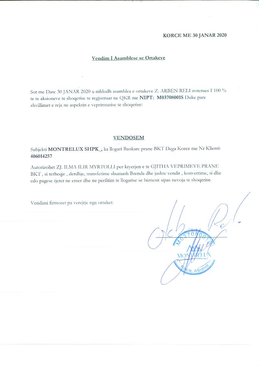 | Çështje Ligjore: | I.Sipas vendimit te asamblese se pergjithshme date 30.01.2020 eshte vendosur : Të autorizojë znj. Irma Myrtolli për kryerjen e të gjitha veprimeve pranë Bankës Kombëtare Tregtare (BKT), si tërheqje, derdhje, transferime shumash brenda dhe jashtë vendit, konvertime si dhe çdo pagesë tjetër në emër dhe në përfitim të llogarisë së biznesit sipas nevojave të shoqërisë . II.Sipas autorizimit date 20.09.2021 behet depozitimi i prokures dt. 27.02.2020 Nr. rep. 789 Nr. Kol. 321, me ane te te ciles emerohet si perfaqesues i posacem Z. Esli Reli me te drejta dhe kompetenca te percaktuara ne kete prokure. |
