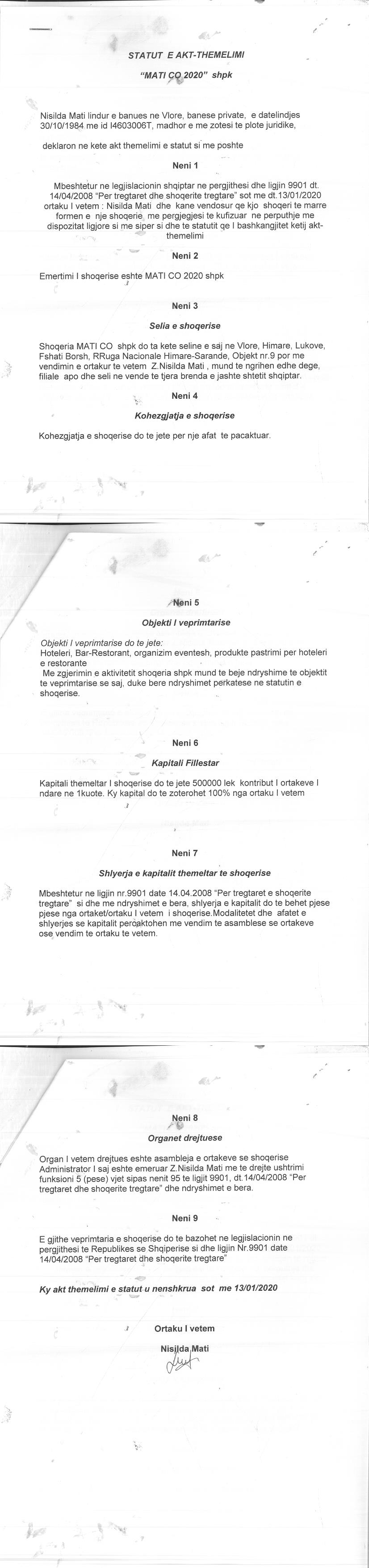 → Ekstrakti Historik i Regjistrit Tregtar date 31.03.2022 → Akt themelimi dhe Statuti i Shoqerise → Vendimi i asamblese se pergjithshme date 28.02.2020 → Vendimi i asamblese se pergjithshme date 29.06.2021 |