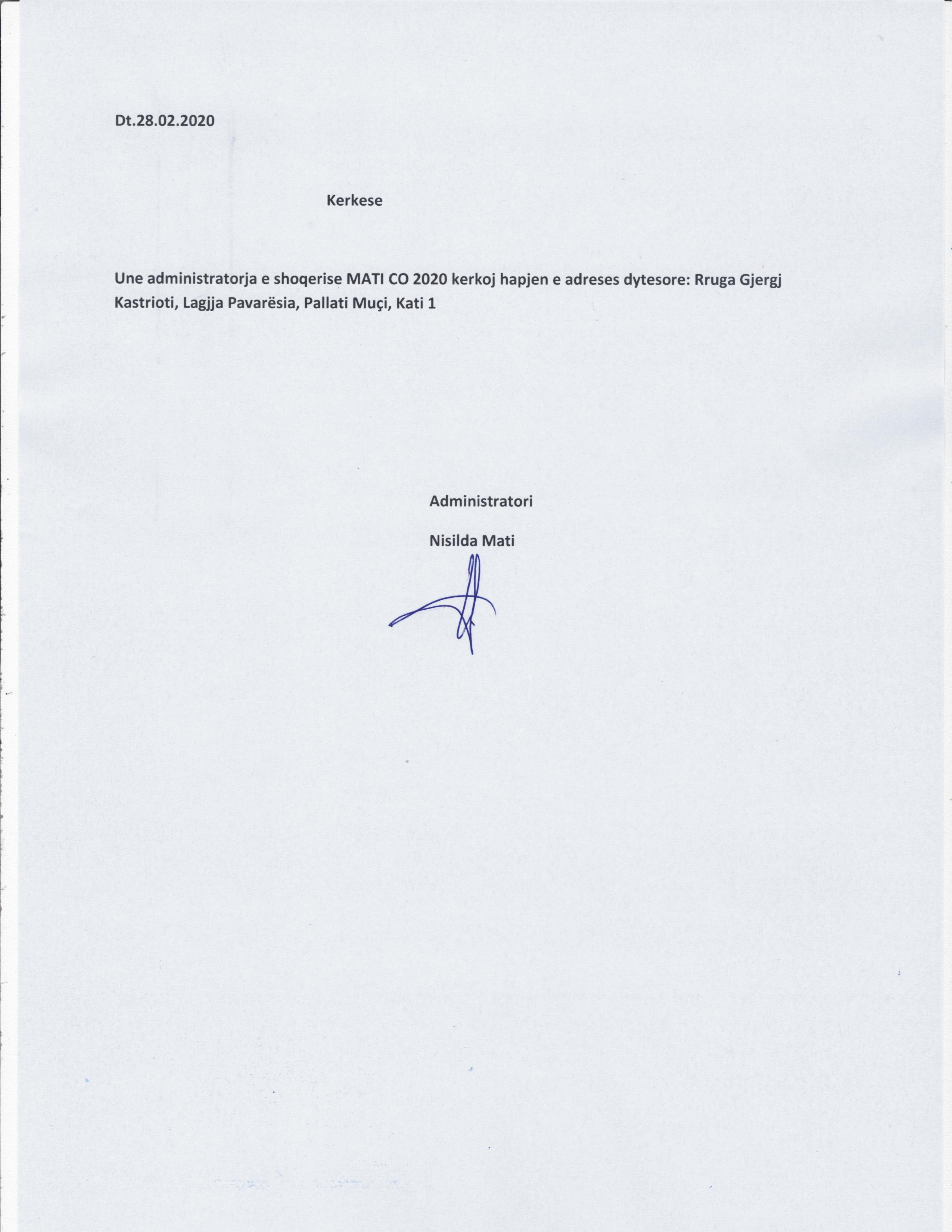 | Emërtime të tjera Tregtare: | MATI CO 2020 |