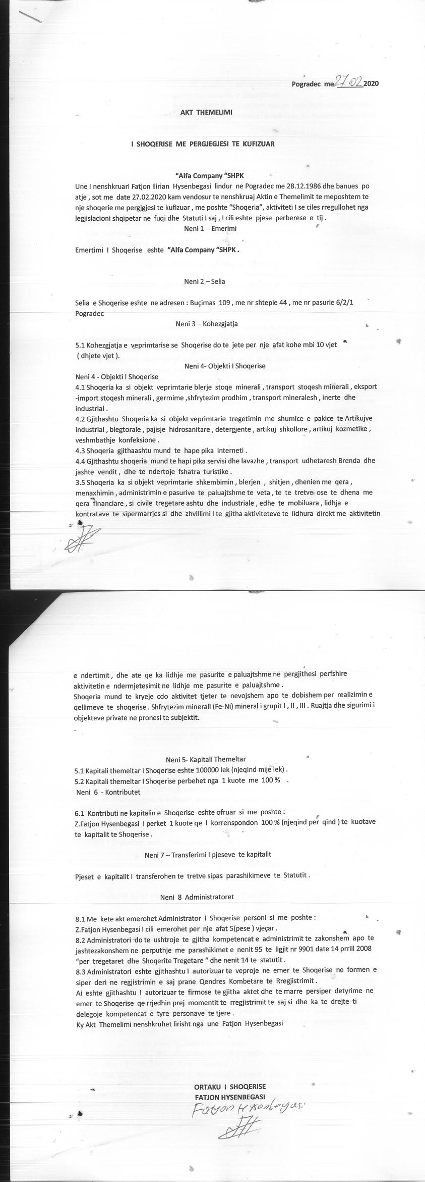 | Çështje Ligjore: | Depozitimi i Prokurës së Pergjithshme me Nr.1570 Rep., Nr.786 Kol., datë 17.06.2020 lëshuar nga i perfaqësuari shoqëria “ALFA COMPANY" SHPK me Nuis (Nipt) M03904601R, me administrator Fatjon Hysenbegasi, i cili emëron z.Altin Hysenbegasi, si përfaqësues te përgjithshëm, me tagra sipas kësaj prokure. |