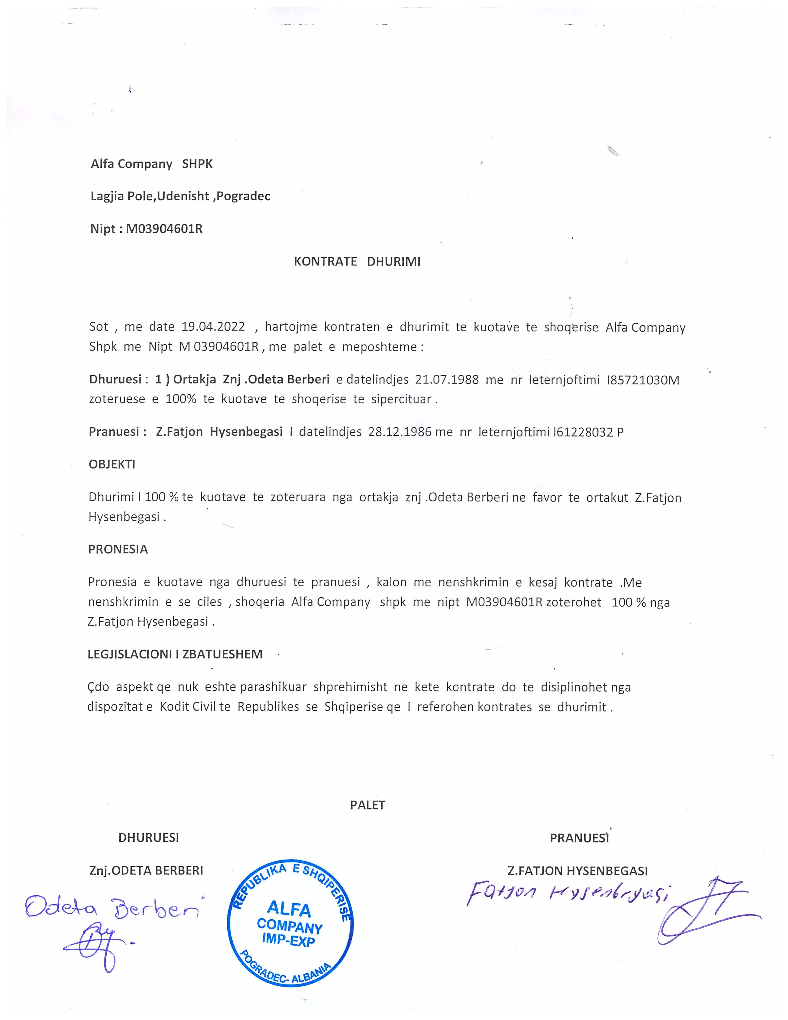 → Ekstrakti Historik i Regjistrit Tregtar date 05.05.2022 → Akt themelimi i Shoqerise → Kontrate e Dhurimit te Kuotave date 07.06.2021 → Kontrate e Dhurimit te Kuotave date 19.04.2022 |