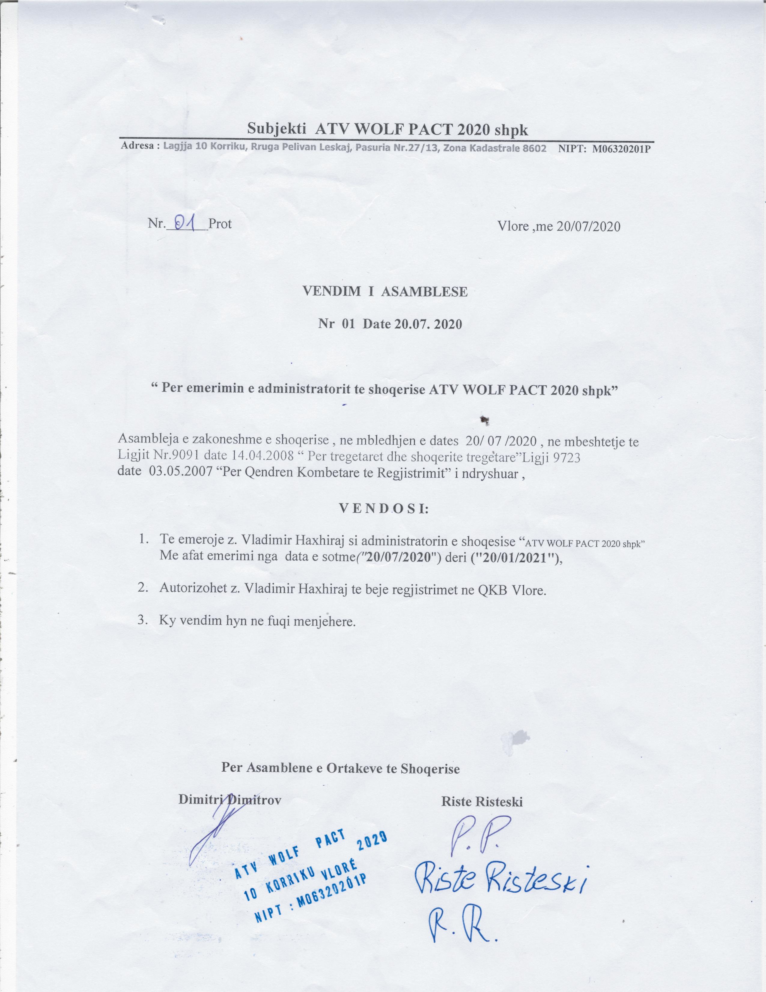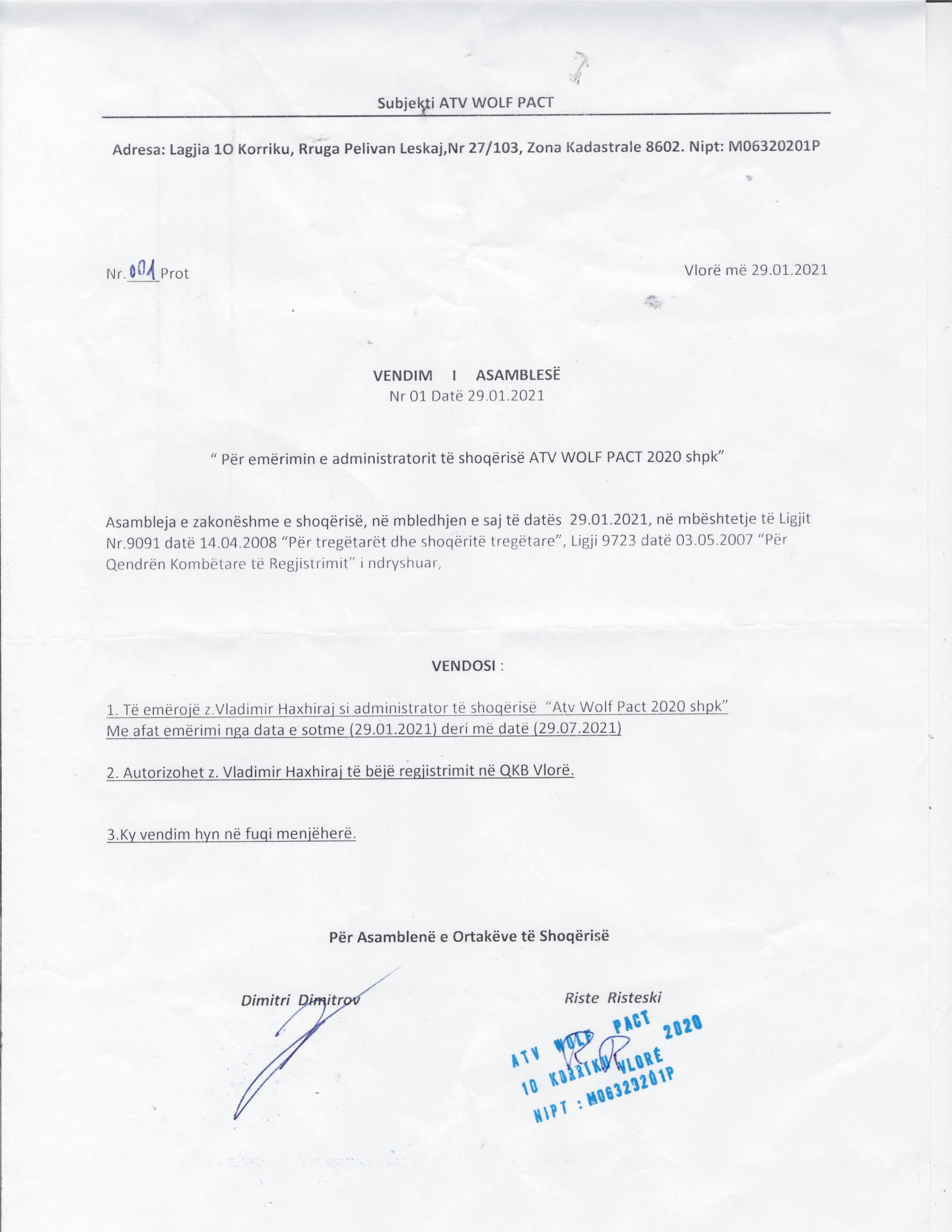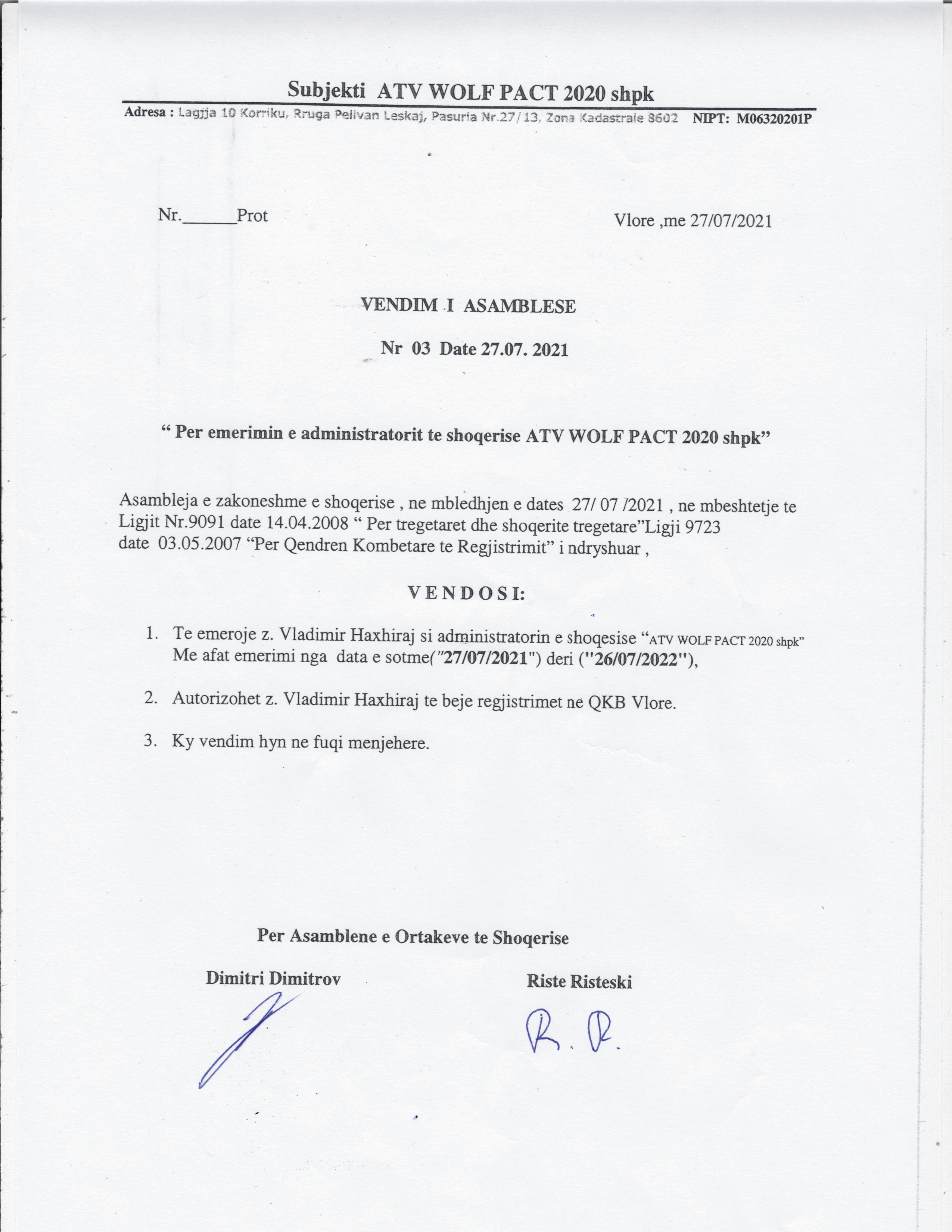 → Ekstrakti Historik i Regjistrit Tregtar date 04.04.2022 → Akt themelimi dhe Statuti i Shoqerise → Vendimi i asamblese se pergjithshme date 20.07.2020 → Vendimi i asamblese se pergjithshme date 29.01.2021 → Vendimi i asamblese se pergjithshme date 05.06.2021 → Vendimi i asamblese se pergjithshme date 27.07.2021 → Vendimi i asamblese se pergjithshme date 15.11.2021 |