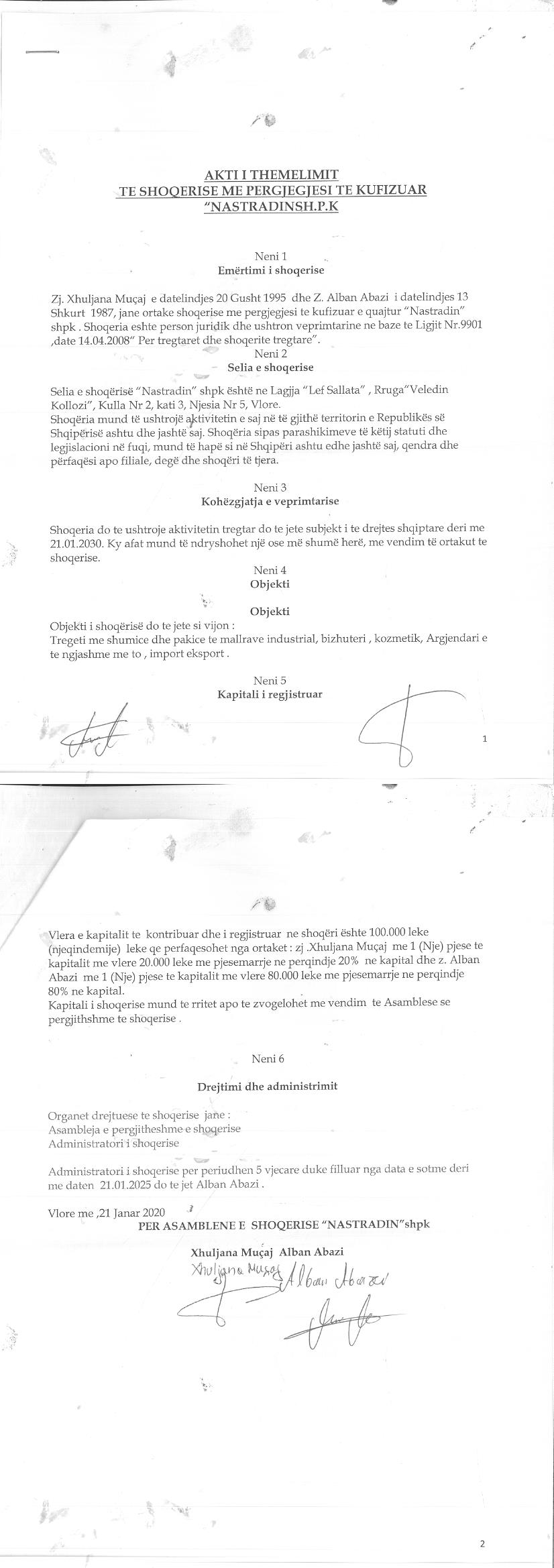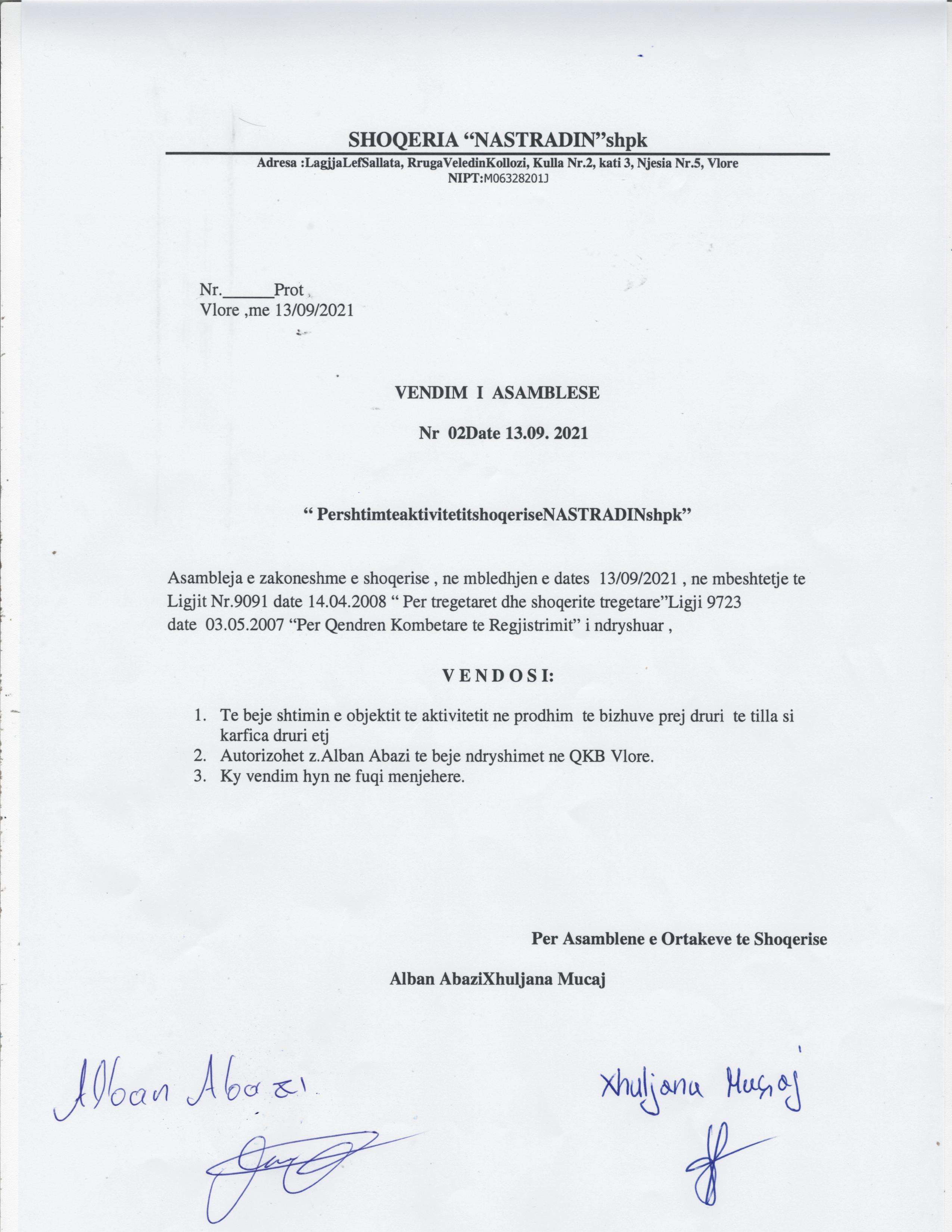 → Ekstrakti Historik i Regjistrit Tregtar date 06.04.2022 → Akt themelimi i Shoqerise → Vendimi i asamblese se pergjithshme date 30.06.2021 → Vendimi i asamblese se pergjithshme date 13.09.2021 |