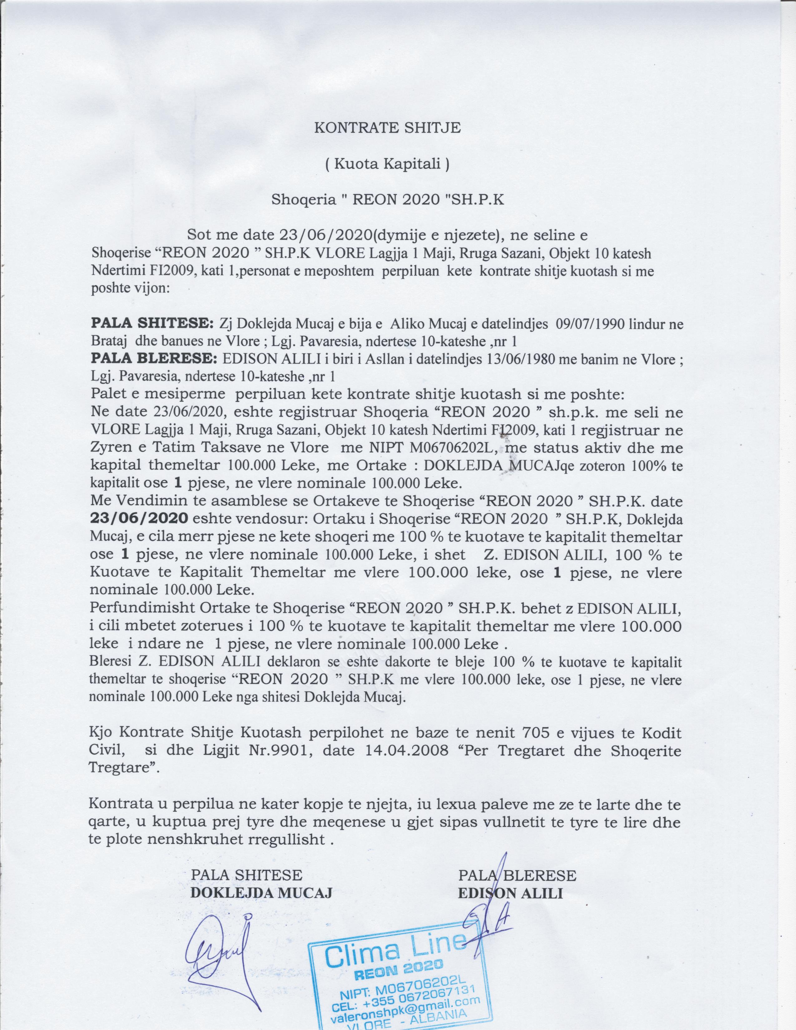 → Ekstrakti Historik I Regjistrit Tregtar date 07.07.2020 → Statuti I Shoqerise → Kontrate e Shitjes se Kuotave date 23.06.2020 |