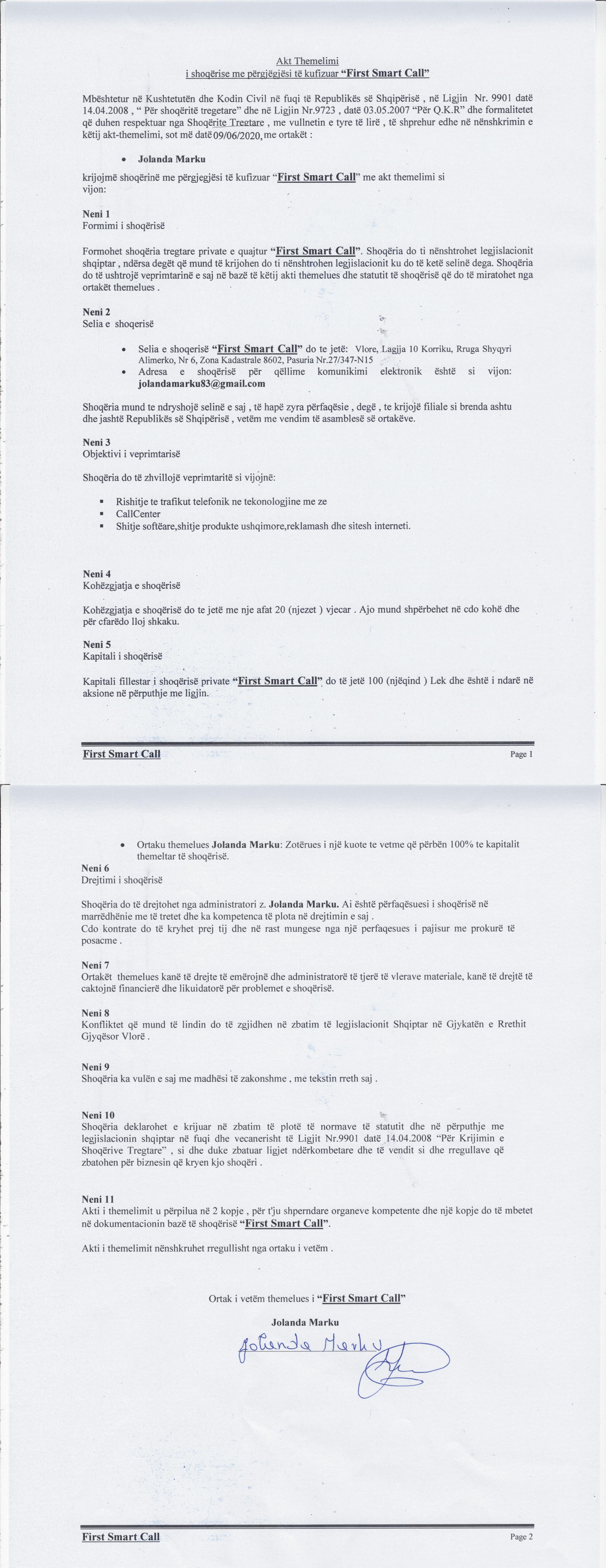 | Objekti i Veprimtarisë: | Rishitje të trafikut telefonik në teknologjinë me zë. Call Center. Shitje software, shitje produkte ushqimore, reklamash dhe sitesh interneti. |