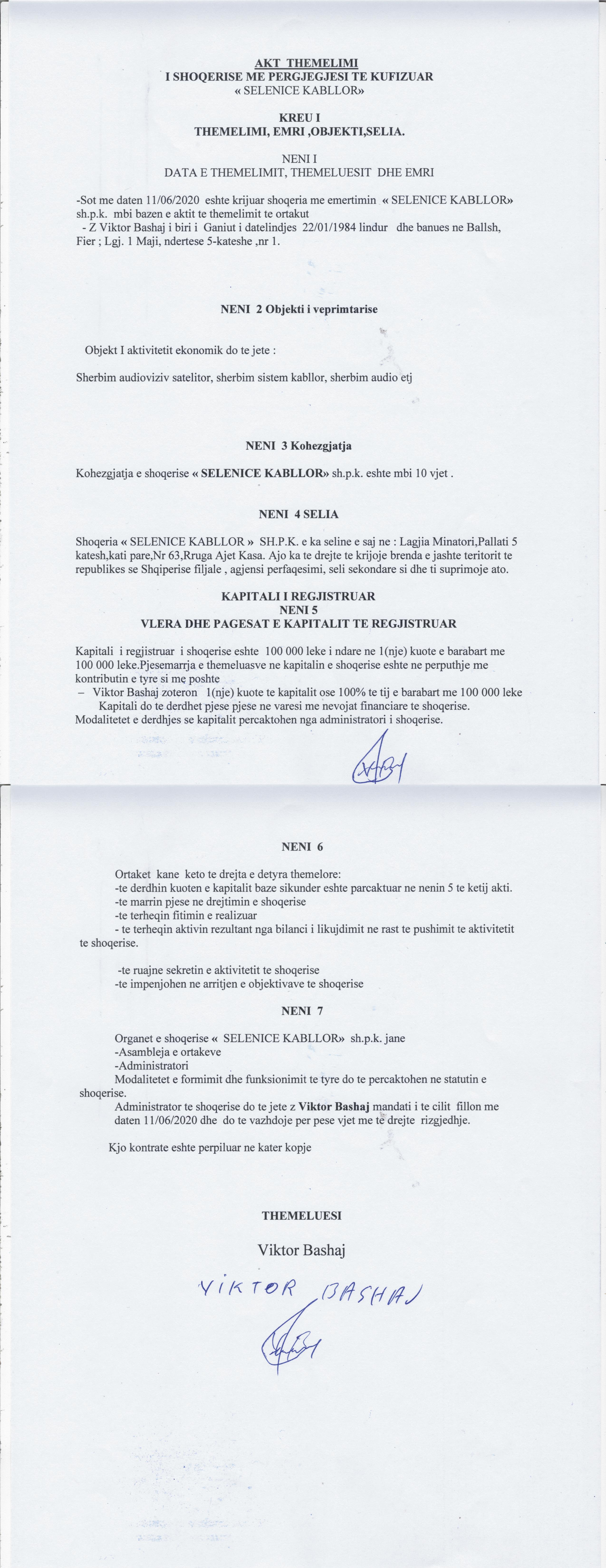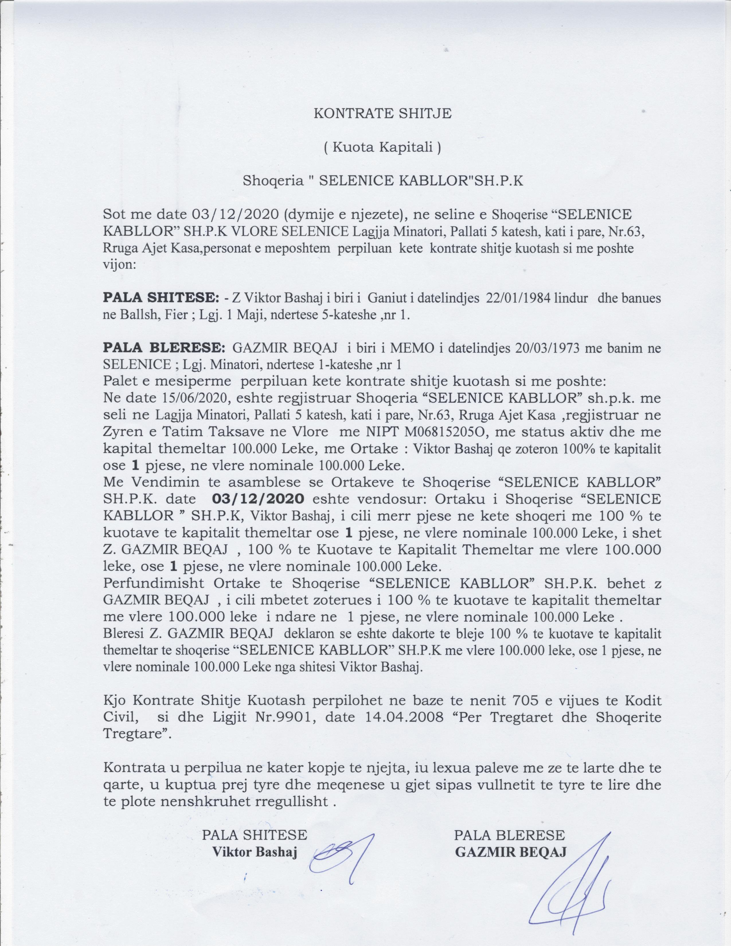 → Ekstrakti Historik I Regjistrit Tregtar date 14.01.2023 → Akti i themelimit → Kontrate shitje date 03.12.2020 |