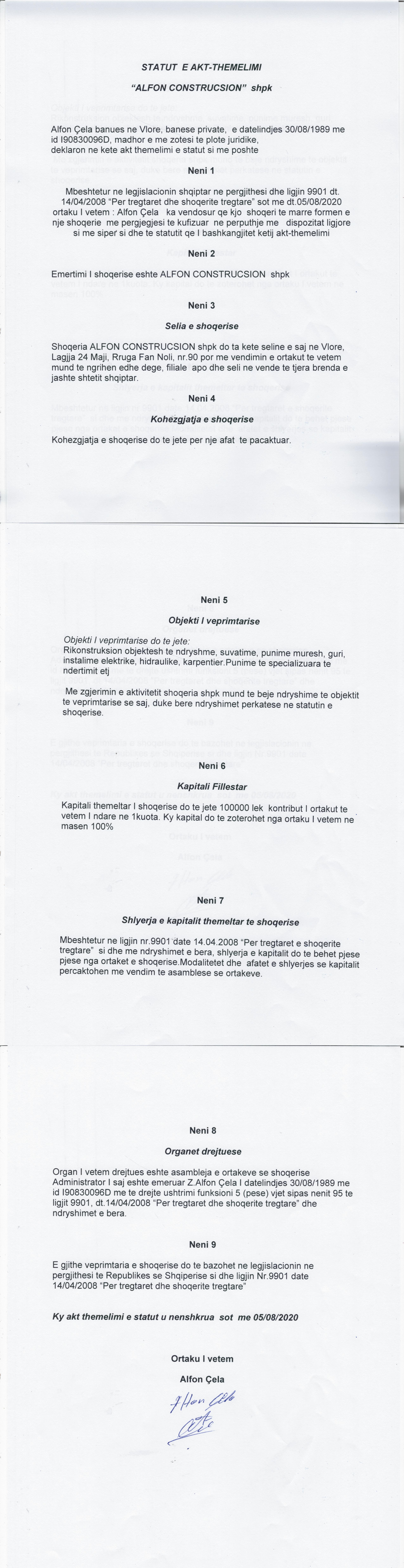 | Emërtime të tjera Tregtare: | ALFON CONSTRUCSION |