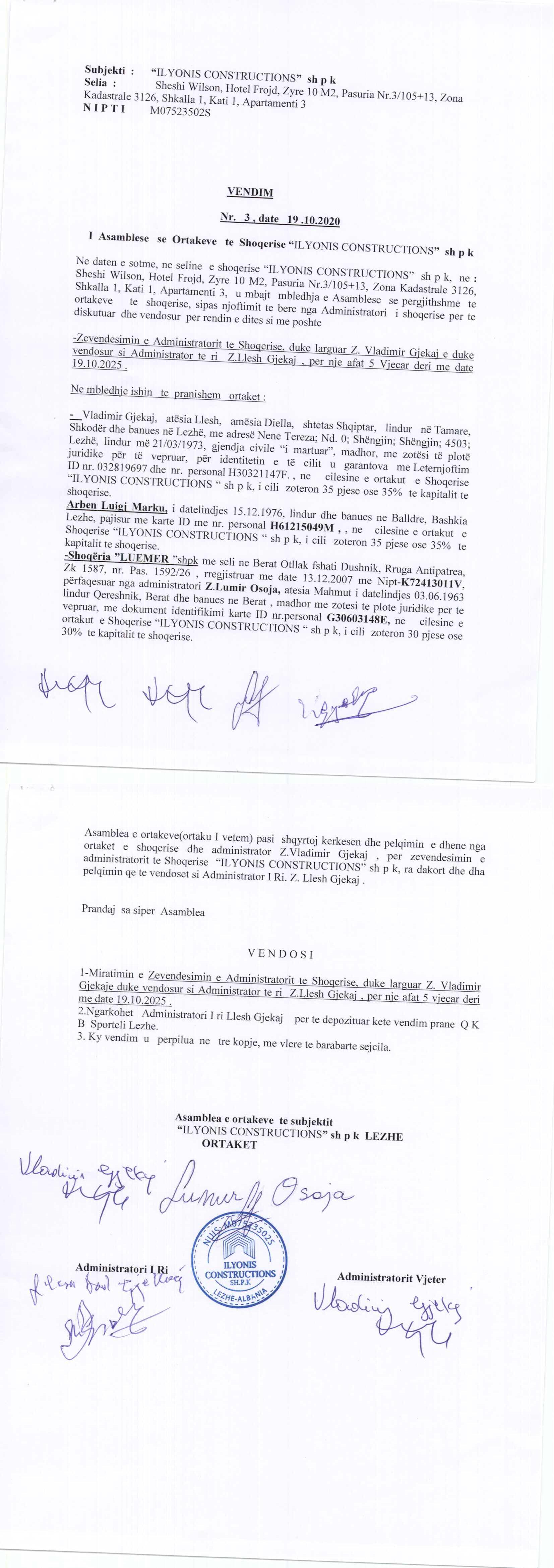 → Ekstrakti Historik i Regjistrit Tregtar date 05.04.2022 → Akt themelimi i Shoqerise → Vendimi i asamblese se pergjithshme date 19.10.2020 → Vendimi i asamblese se pergjithshme date 14.06.2021 → Kontrate e Shitblerjes se Kuotave date 15.06.2021 → Vendimi i asamblese se pergjithshme date 30.06.2021 |