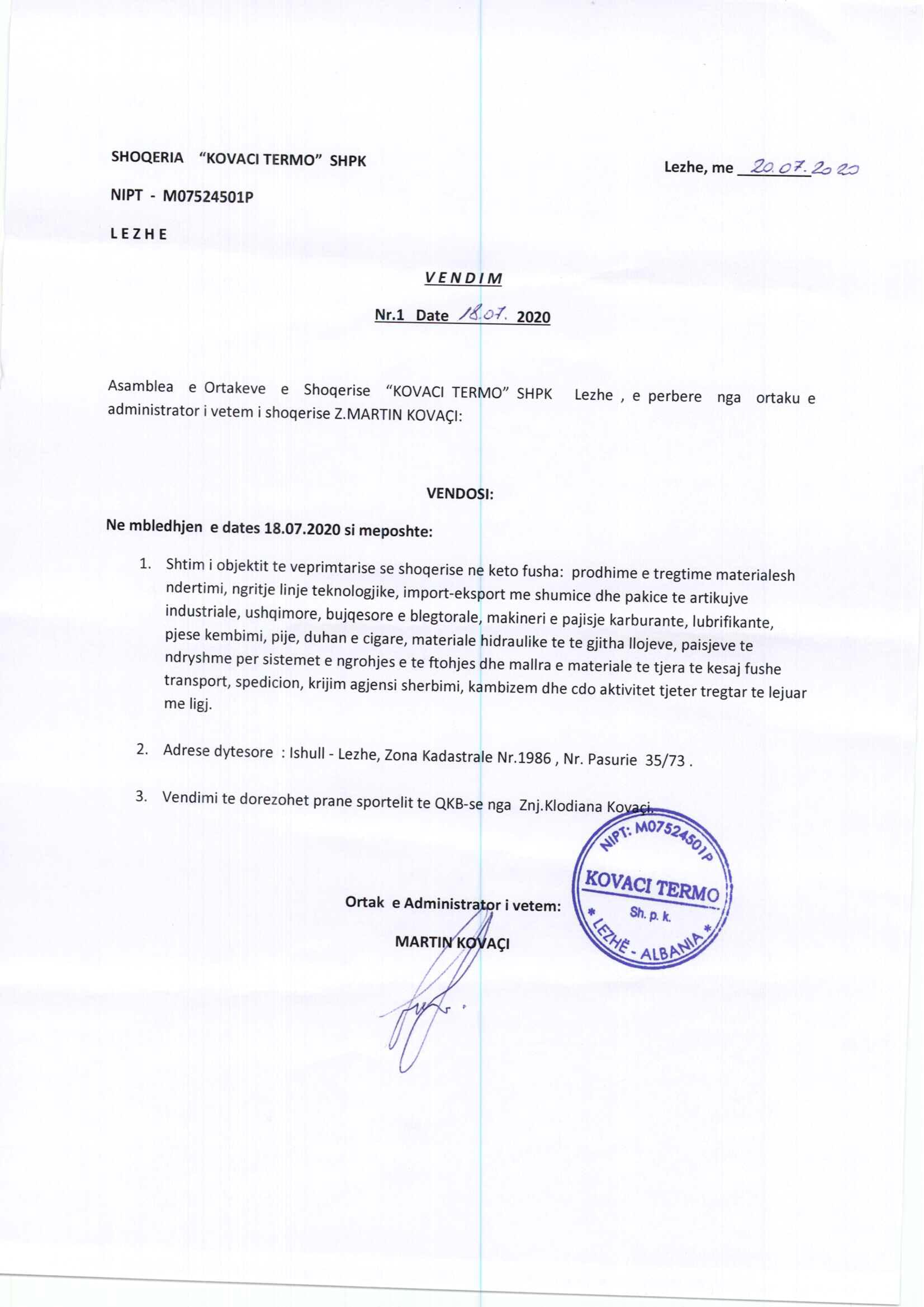 Vendimi i asamblese se pergjithshme date 20.07.2020