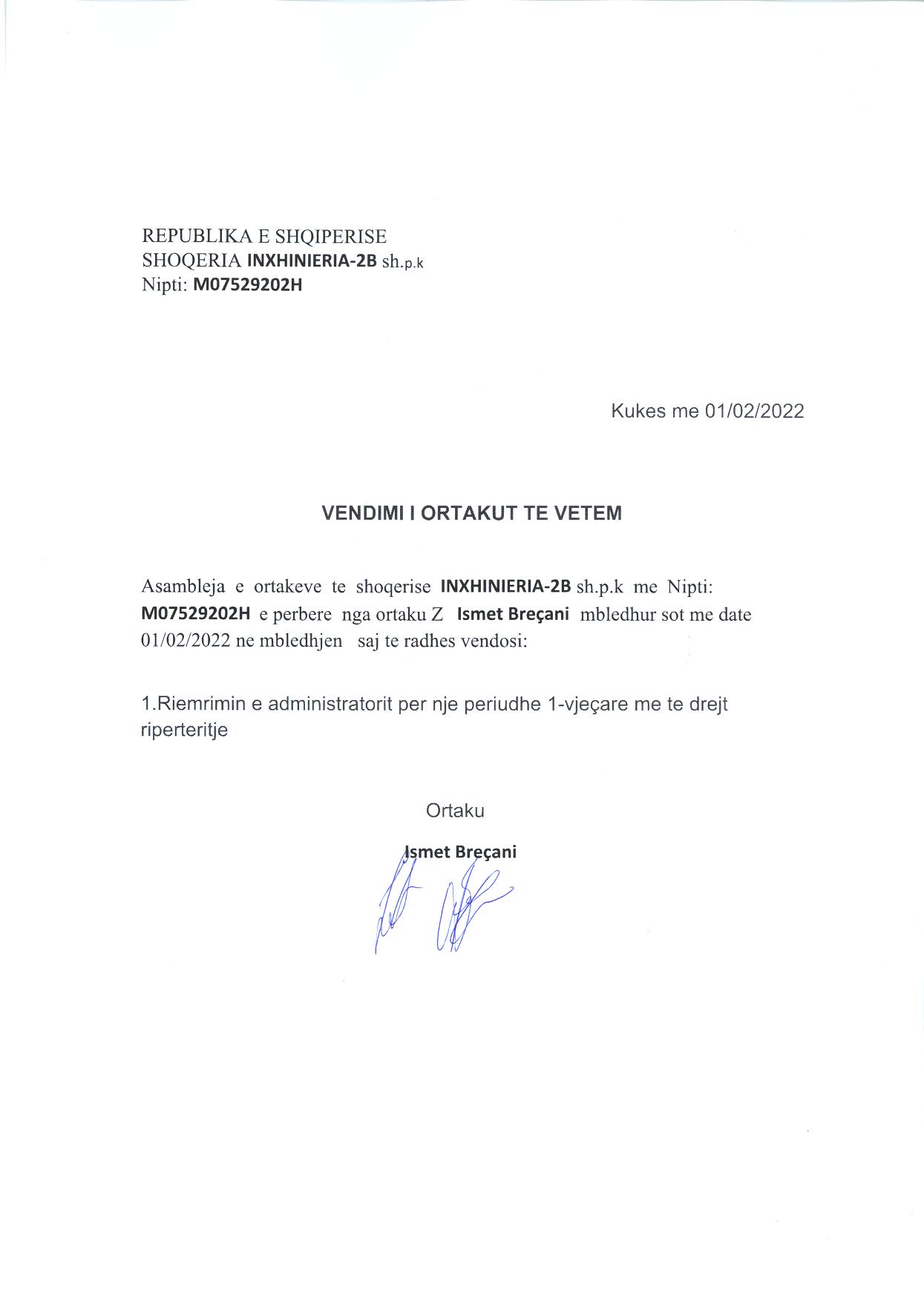 → Ekstrakti Historik i Regjistrit Tregtar date 07.04.2022 → Akt themelimi i Shoqerise → Vendimi i asamblese se pergjithshme date 03.02.2020 → Vendimi i asamblese se pergjithshme date 31.12.2020 → Kontrate e Dhurimit te Kuotave date 31.12.2020 → Vendimi i asamblese se pergjithshme date 29.05.2021 → Vendimi i asamblese se pergjithshme date 06.07.2021 → Vendimi i asamblese se pergjithshme date 01.02.2022 |