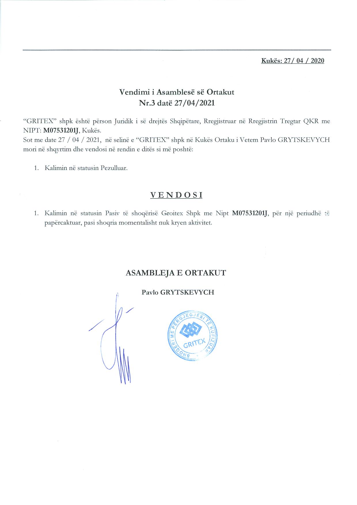 → Ekstrakti Historik i Regjistrit Tregtar date 07.04.2022 → Akt themelimi i Shoqerise → Vendimi i asamblese se pergjithshme date 27.04.2021 |
