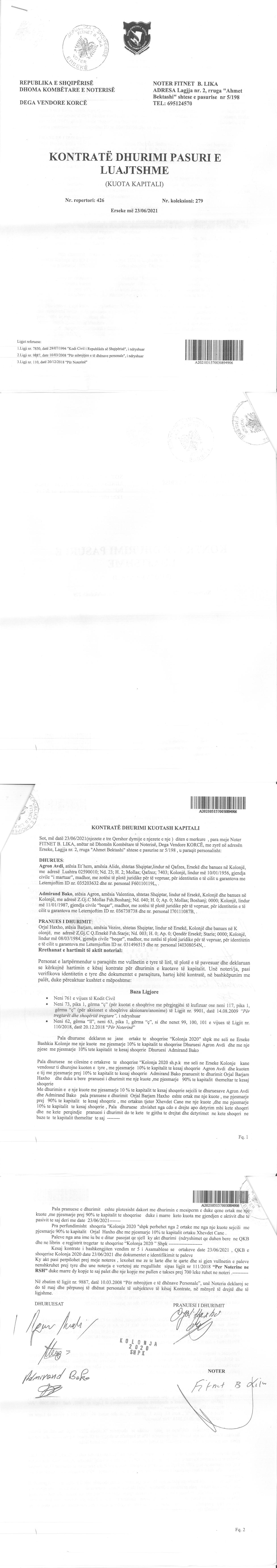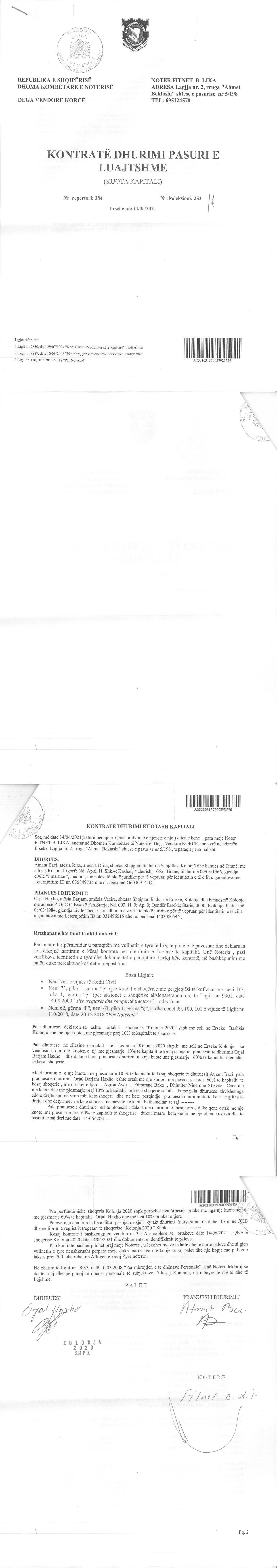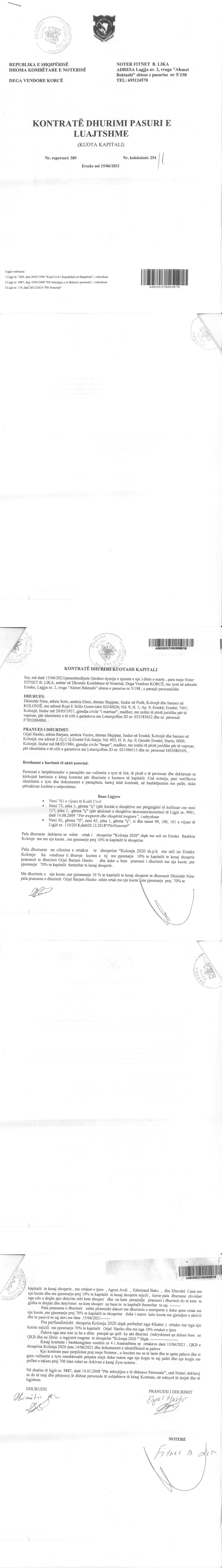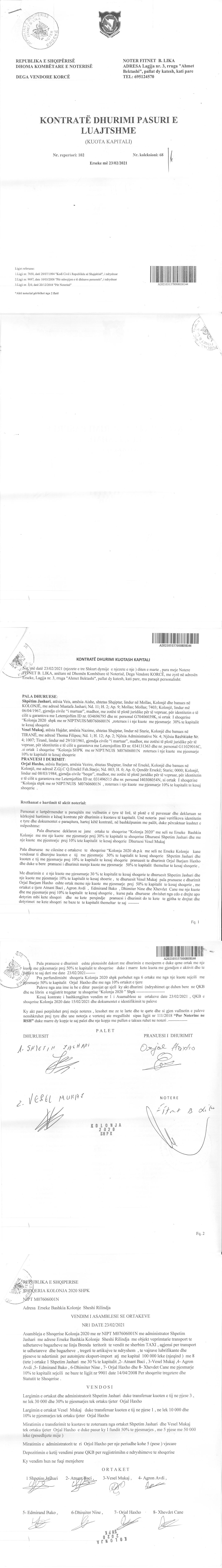 → Ekstrakti Historik i Regjistrit Tregtar date 19.04.2022 → Akt themelimi i Shoqerise → Vendim i Asamblese se Pergjithshme date 17.02.2020 → Kontrate e Dhurimit te Kuotave date 19.02.2020 → Vendim i Asamblese se Pergjithshme date 23.02.2021 → Kontrate e Dhurimit te Kuotave date 23.02.2021 → Vendim i Asamblese se Pergjithshme date 14.06.2021 → Kontrate e Dhurimit te Kuotave date 14.06.2021 → Vendim i Asamblese se Pergjithshme date 15.06.2021 → Kontrate e Dhurimit te Kuotave date 15.06.2021 → Vendim i Asamblese se Pergjithshme date 23.06.2021 → Kontrate e Dhurimit te Kuotave date 23.06.2021 |