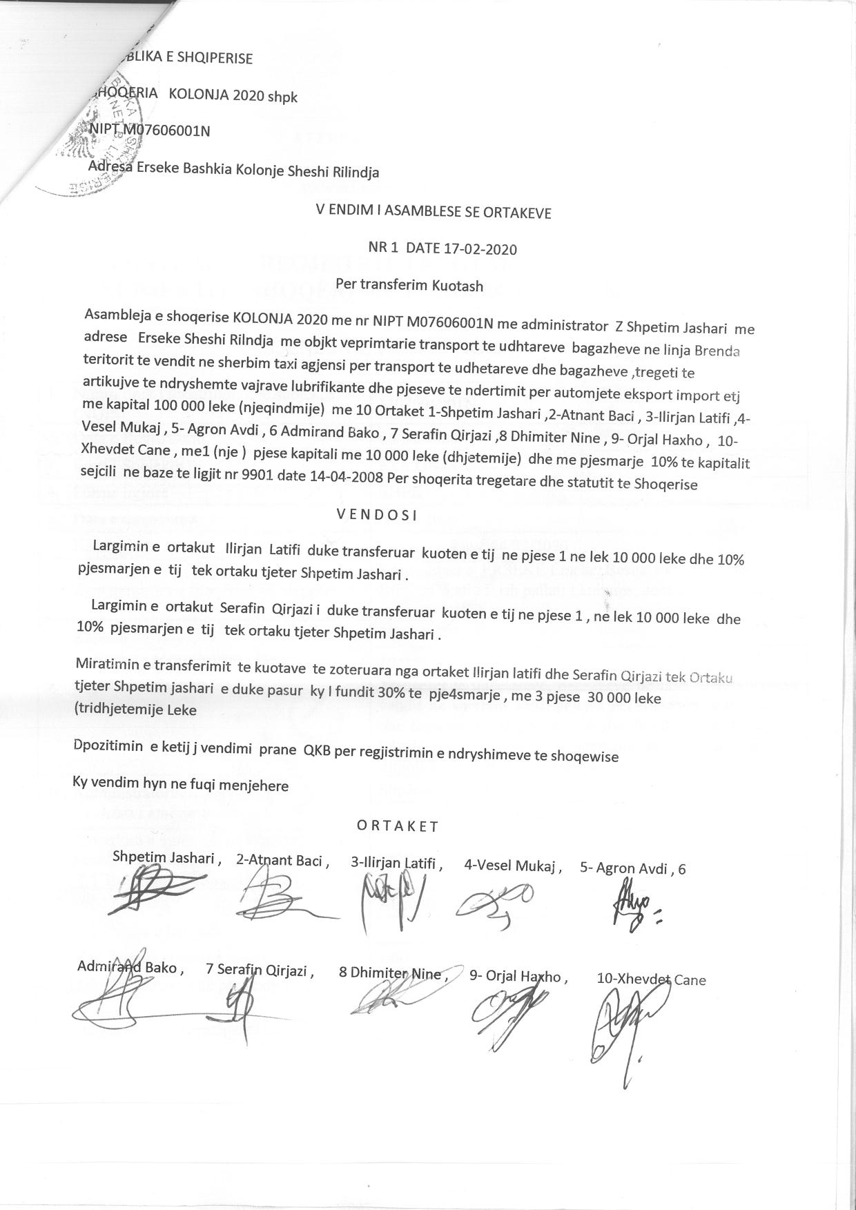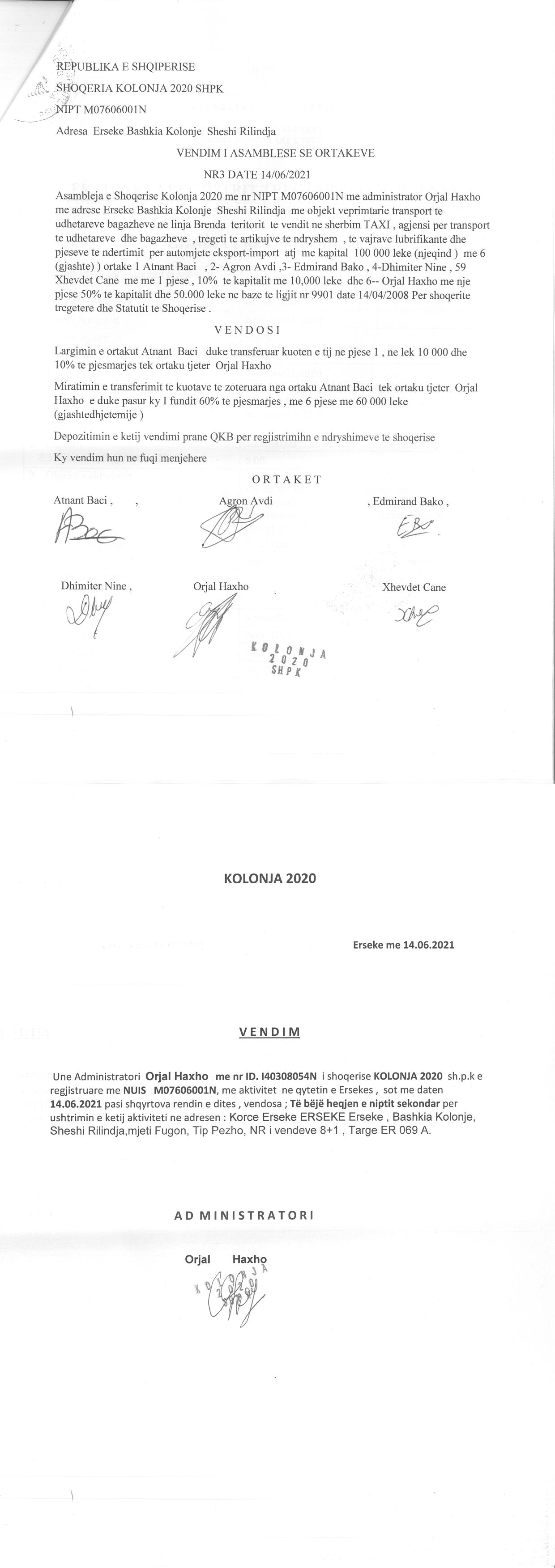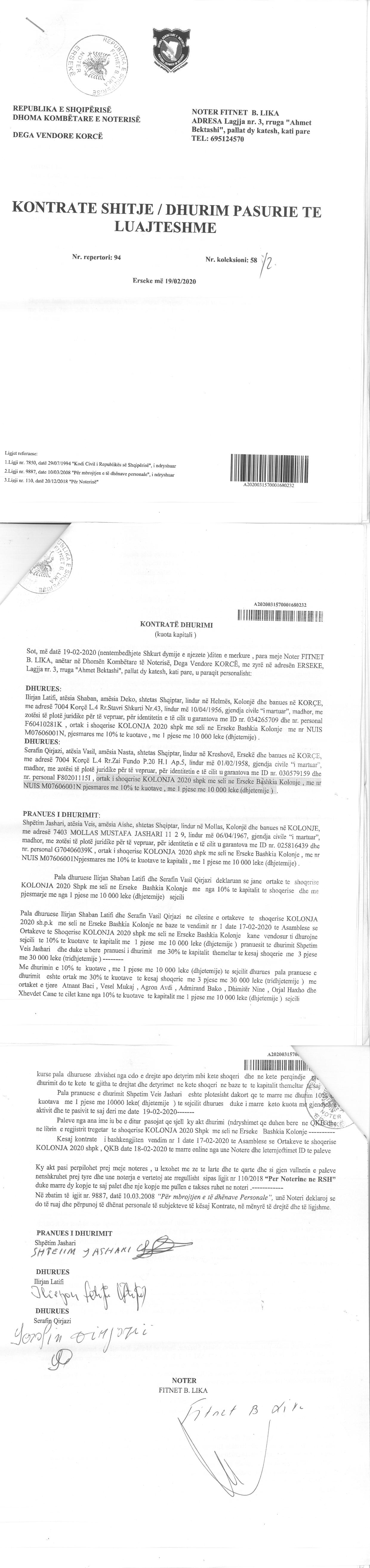 → Ekstrakti Historik i Regjistrit Tregtar date 19.04.2022 → Akt themelimi i Shoqerise → Vendim i Asamblese se Pergjithshme date 17.02.2020 → Kontrate e Dhurimit te Kuotave date 19.02.2020 → Vendim i Asamblese se Pergjithshme date 23.02.2021 → Kontrate e Dhurimit te Kuotave date 23.02.2021 → Vendim i Asamblese se Pergjithshme date 14.06.2021 → Kontrate e Dhurimit te Kuotave date 14.06.2021 → Vendim i Asamblese se Pergjithshme date 15.06.2021 → Kontrate e Dhurimit te Kuotave date 15.06.2021 → Vendim i Asamblese se Pergjithshme date 23.06.2021 → Kontrate e Dhurimit te Kuotave date 23.06.2021 |
