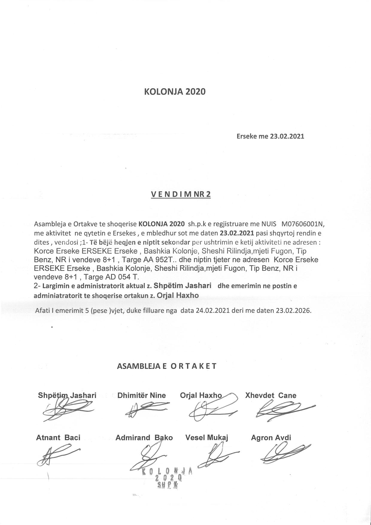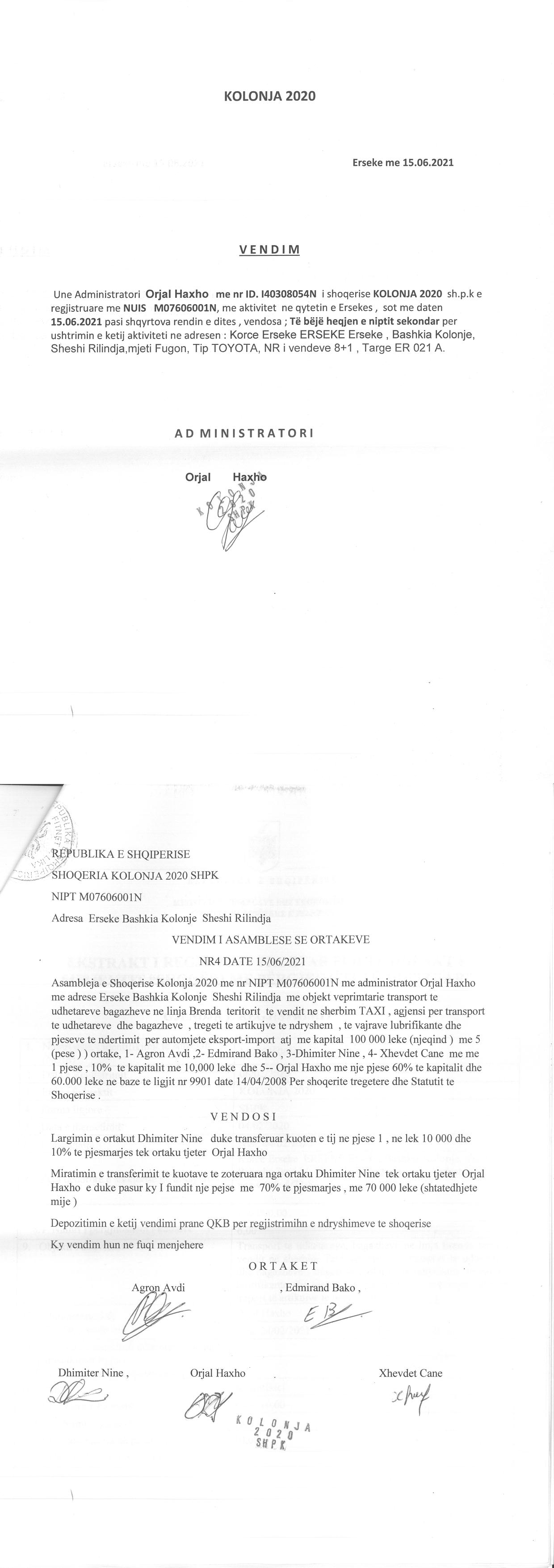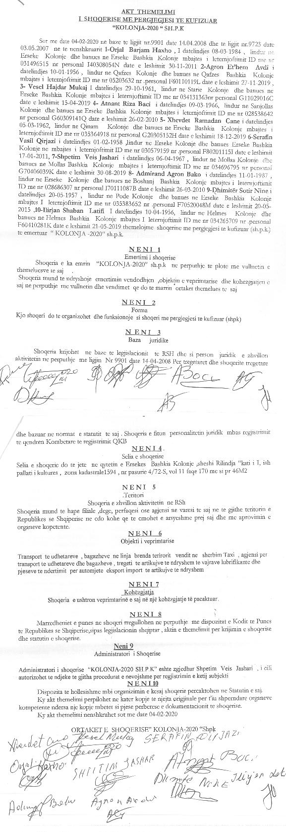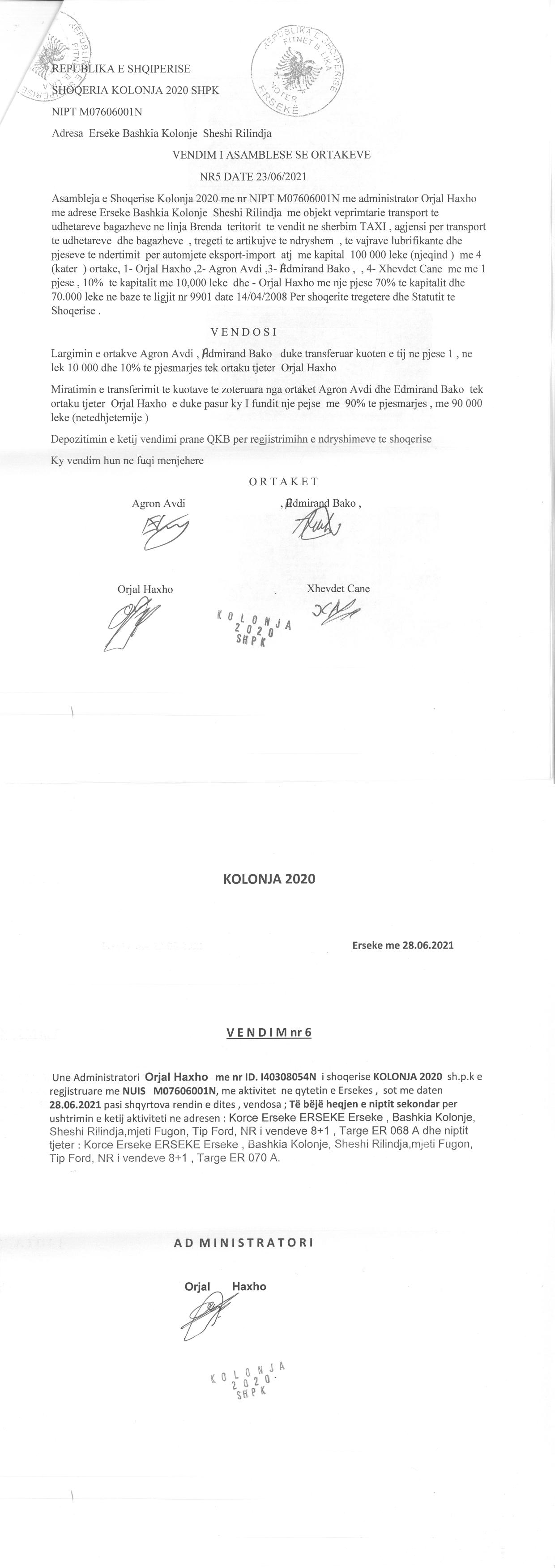→ Ekstrakti Historik i Regjistrit Tregtar date 19.04.2022 → Akt themelimi i Shoqerise → Vendim i Asamblese se Pergjithshme date 17.02.2020 → Kontrate e Dhurimit te Kuotave date 19.02.2020 → Vendim i Asamblese se Pergjithshme date 23.02.2021 → Kontrate e Dhurimit te Kuotave date 23.02.2021 → Vendim i Asamblese se Pergjithshme date 14.06.2021 → Kontrate e Dhurimit te Kuotave date 14.06.2021 → Vendim i Asamblese se Pergjithshme date 15.06.2021 → Kontrate e Dhurimit te Kuotave date 15.06.2021 → Vendim i Asamblese se Pergjithshme date 23.06.2021 → Kontrate e Dhurimit te Kuotave date 23.06.2021 |