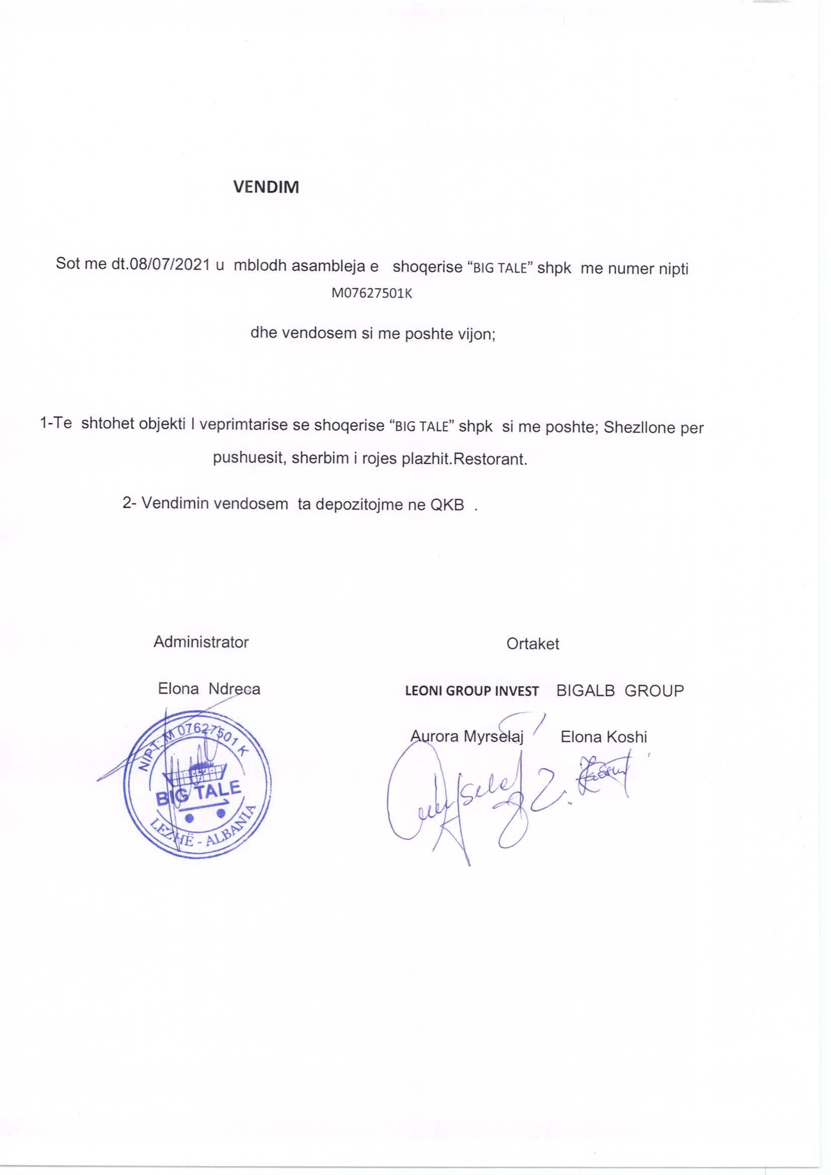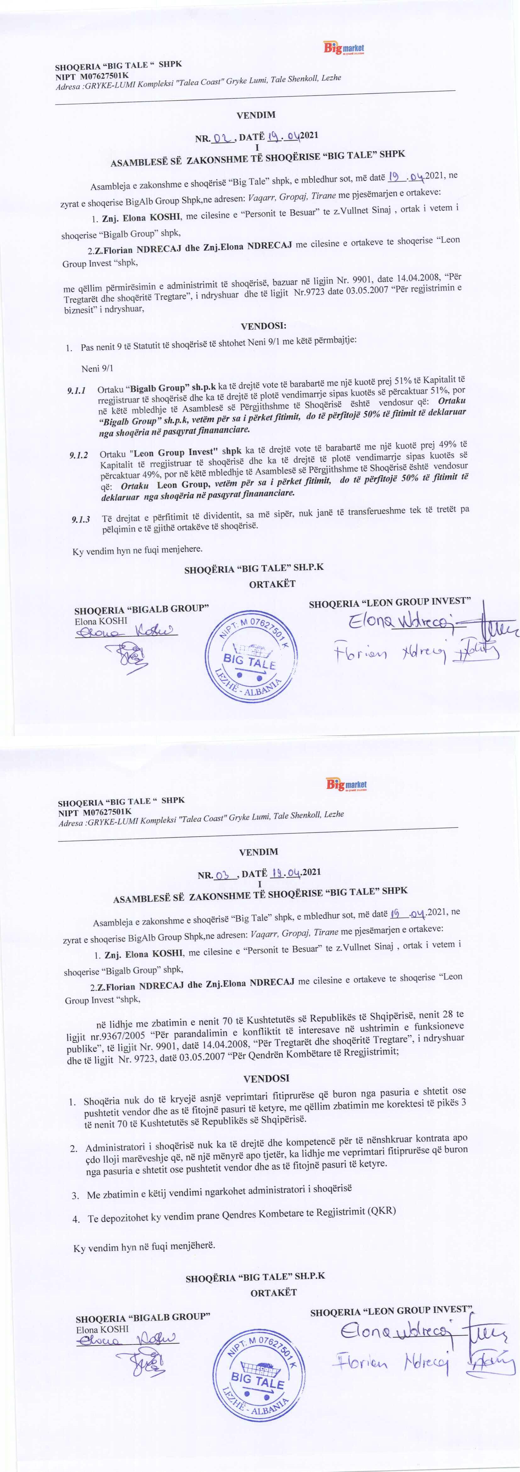 | Shoqëri Mëmë / Zotërues për këtë Subjekt: | “BIGALB GROUP”, shoqëri me përgjegjësi të kufizuar, e themeluar më datë 17/03/2011, sipas ligjeve të Republikës së Shqipërisë, me numër identifikimi në regjistrin tregtar NIPT L11521002M, me adresë në aktuale në Tirane Vaqarr GROPAJ Fshati Gropaj, Godina Tirana Cash & Carry, Kati 2, Vaqarr, dhe me administrator Elona Koshi. Ortak i vetëm i shoqërisë është Vullnet Sinaj (zoterues pasiv), zotërues për 100% të kapitalit. (Sipas të dhënave të QKB deri më datë 15.08.2024) Sipas Ekstraktit Historik te Regjistrit te Pronarit Perfitues, depozituar në QKB date 03.03.2022, terhequr datë 15.08.2024, Pronaret perfitues te subjektit “BIG TALE”, zoterues te 25% te kapitalit e me teper, janë: Vullnet Sinaj, shtetas shqiptar, i datelindjes 1965, pronar perfitues per 51% te pronesise pasi zoteron 100% te kapitalit të “BIGALB GROUP” shpk – shoqëri mëmë për 51% te “BIG TALE”. Data e percaktimit si pronar perfitues është 18.02.2020. Elona Ndrecaj, shtetas shqiptar, i datelindjes 1982, pronar perfitues per 49% te pronesise në formë direkte. Data e percaktimit si pronar perfitues është 17.02.2022. |