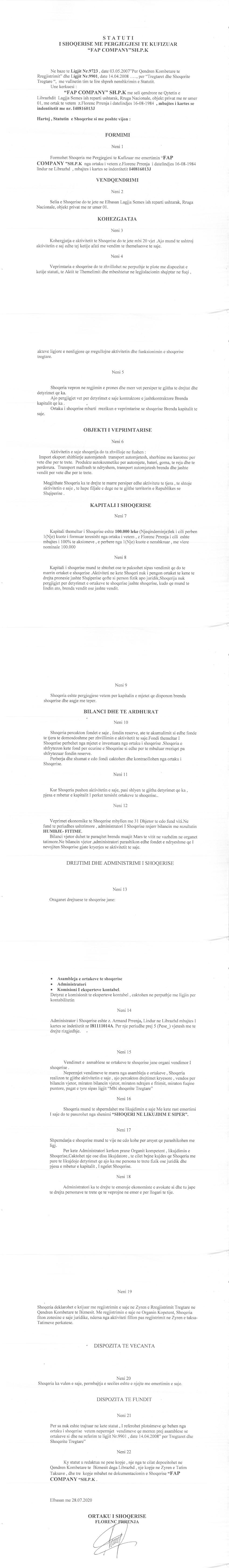 → Ekstrakti Historik I Regjistrit Tregtar date 19.08.2020 → Statuti I Shoqerise |