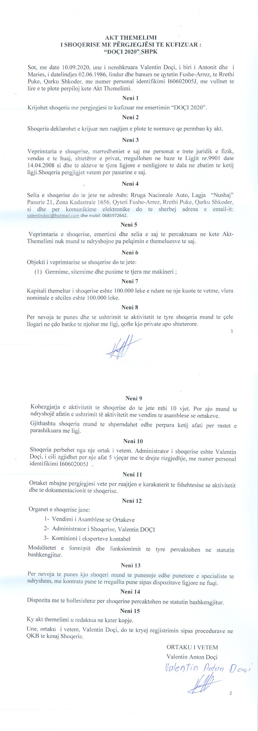 → Ekstrakti Historik I Regjistrit Tregtar date 17.09.2020 → Akt themelimi i Shoqerise → Ekstrakti Historik I Regjistrit Tregtar date 24.01.2023 → Ekstrakti Historik I Regjistrit Tregtar date 25.05.2023 |