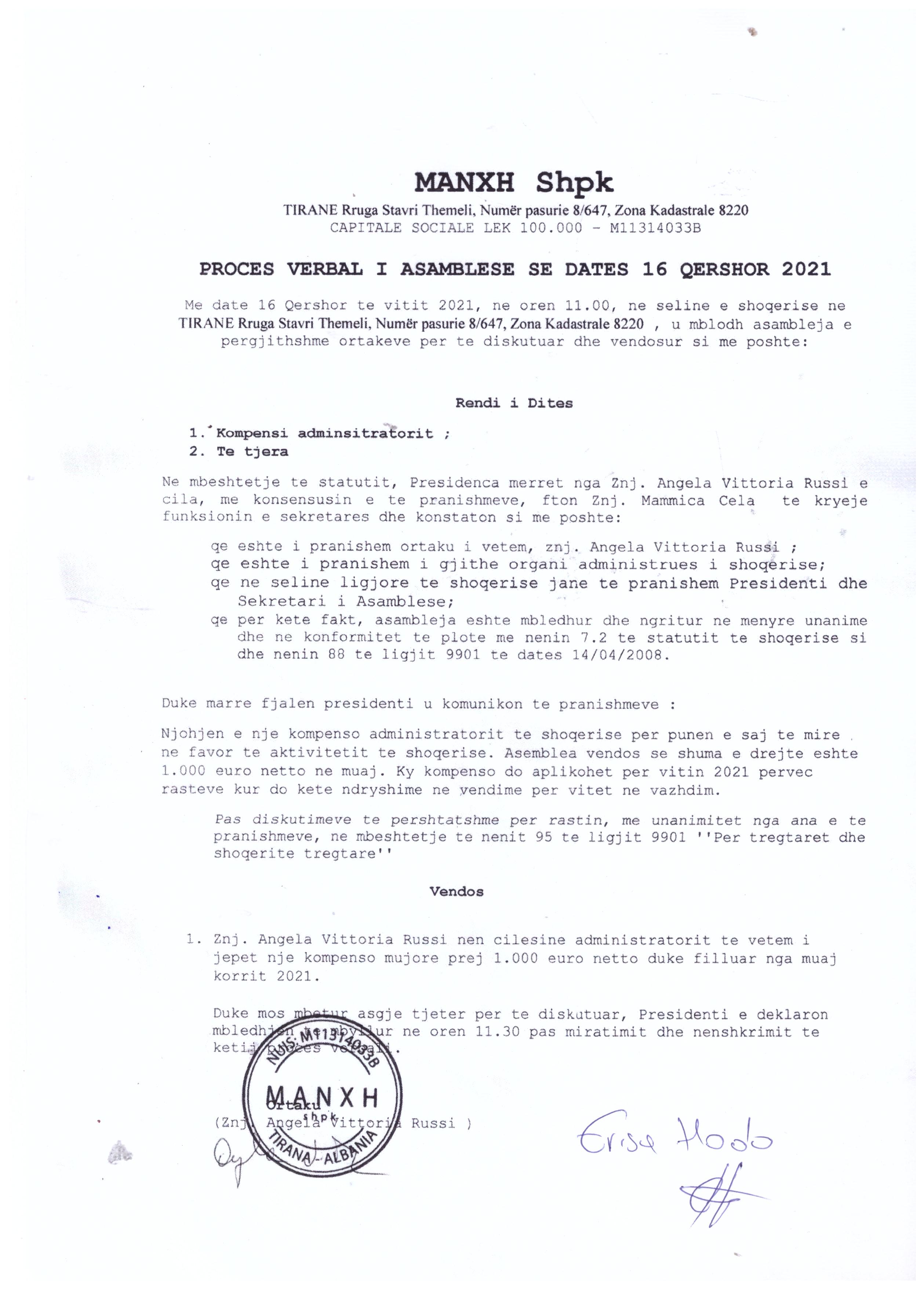 → Ekstrakt Historik i Regjistrit Tregtar, date 1/9/2021 → Statuti i Shoqerise, date 12/1/2021 → Vendimi i Asamblese, date 16/6/2021 |