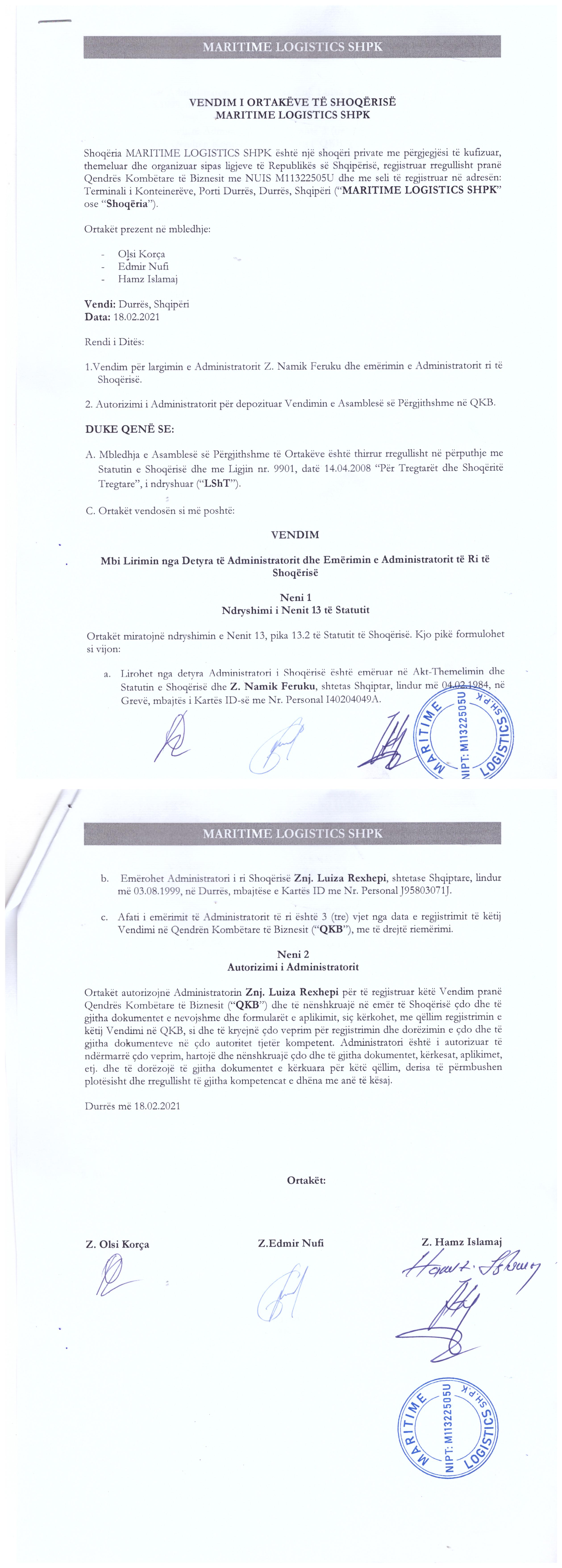 → Ekstrakt Historik i Regjistrit Tregtar, date 9/9/2021 → Akt themelimi i shoqerise, date 20.01.2021 → Vendimi i Asamblese se pergjithshme , date 18/02/2021 |