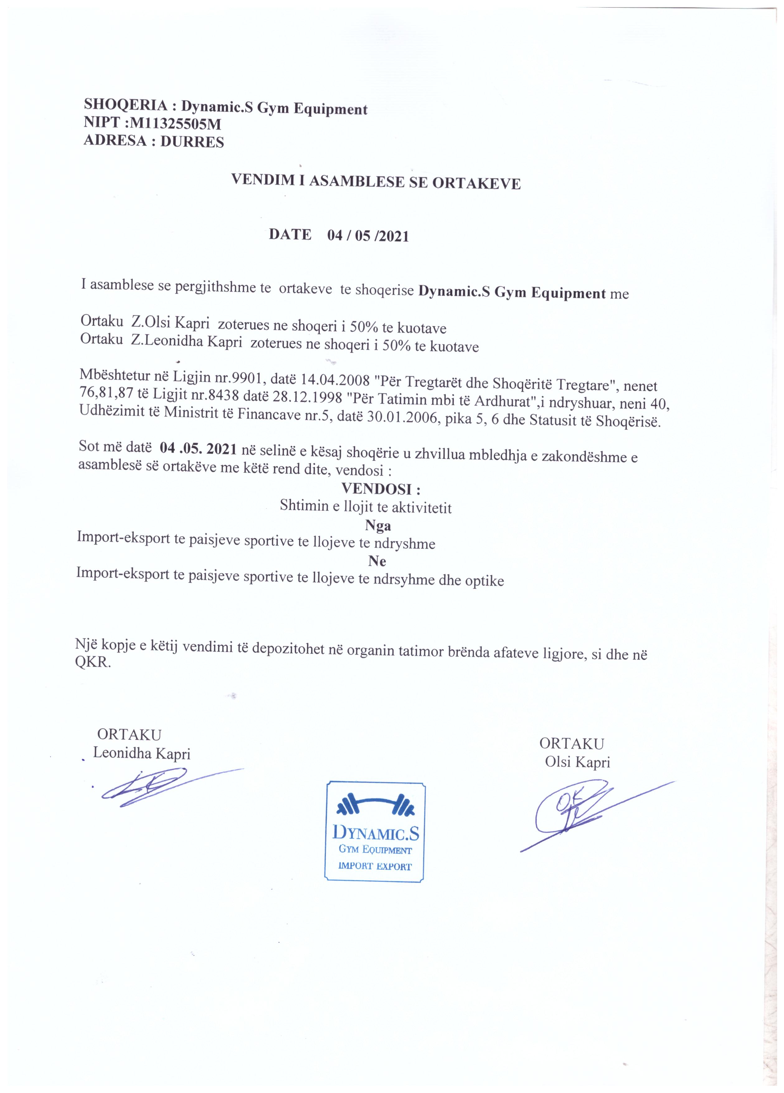 → Ekstrakt Historik i Regjistrit Tregtar, date 10.09.2021 → Akt themelimi i shoqerise, date 22.01.2021 → Vendimi i asamblese se ortakeve, date 29.01.2021 → Vendimi i asamblese se ortakeve, date 04.05.2021 |