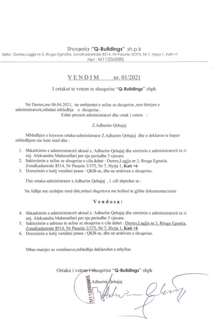 → Ekstrakt Historik i Regjistrit Tregtar, date 13.09.2021 → Akt themelimi i shoqerise, date 21.01.2021 → Vendimi i ortakut te vetem , date 06.04.2021 |