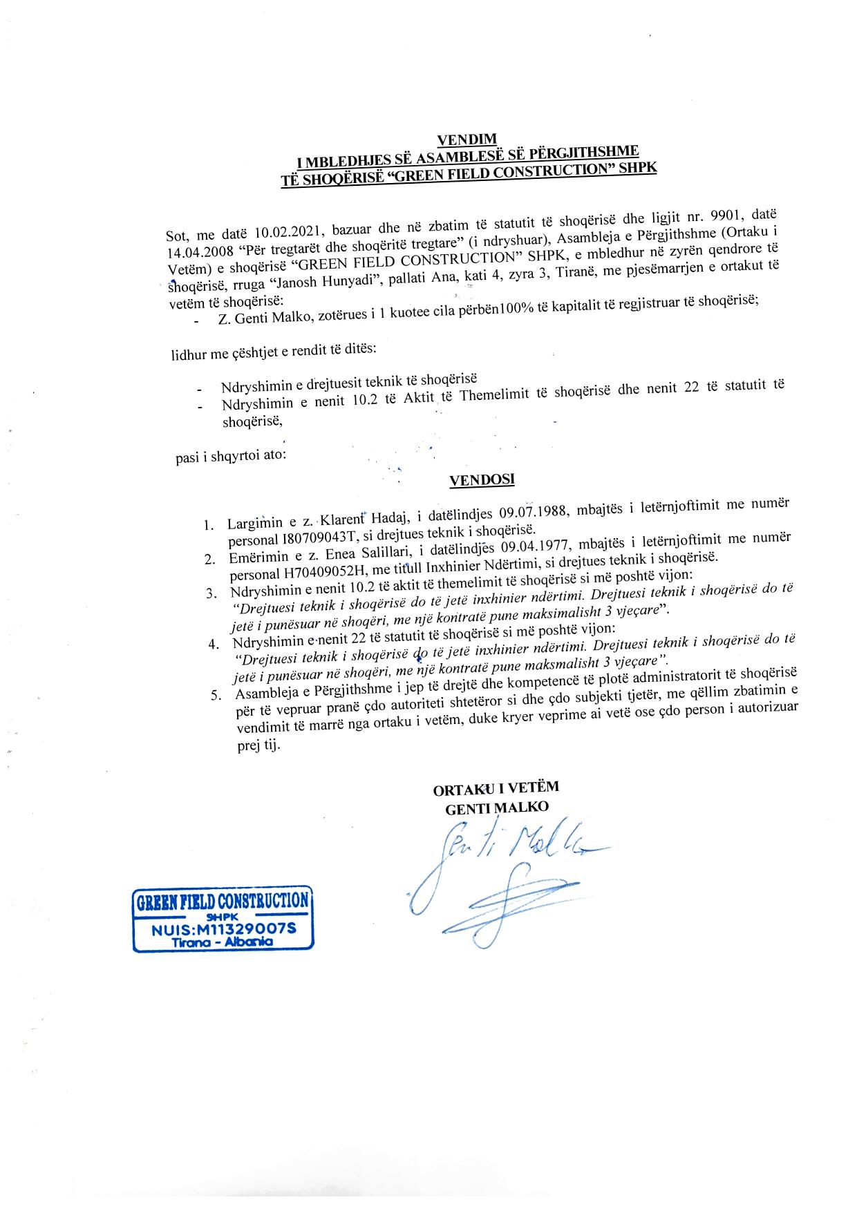 → Ekstrakt Historik i Regjistrit Tregtar, date 15.09.2021 → Akt themelimi i shoqerise, date 26.01.2021 → Vendimi i asamblese, date 10.02.2021 |