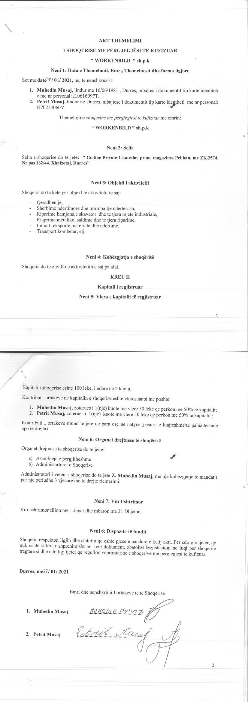 → Ekstrakt Historik i Regjistrit Tregtar, date 15/9/2021 → Akt themelimi i Shoqerise, date 27.01.2021 |