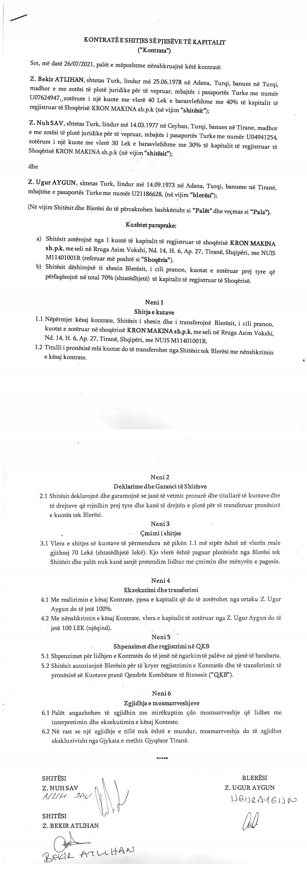 → Ekstrakt Historik i Regjistrit Tregtar, date 16/9/2021 → Statuti i shoqerise, date 21.01.2021 → Vendimi i asamblese se pergjithshme , date 5.04.2021 → Kontrate shitje kuotash , date 26.07.2021 |