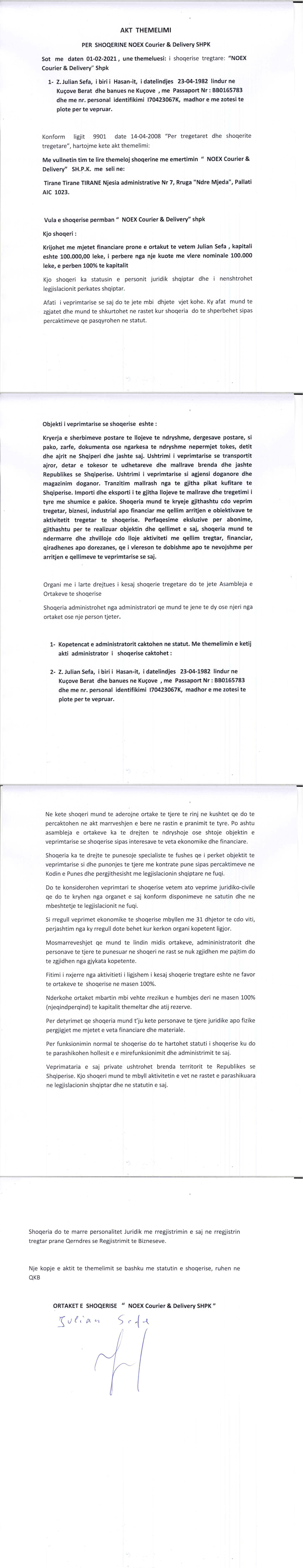 → Ekstrakt Historik i Regjistrit Tregtar, date 20/9/2021 → Akt themelimi i shoqerise, date 01.02.2021 |