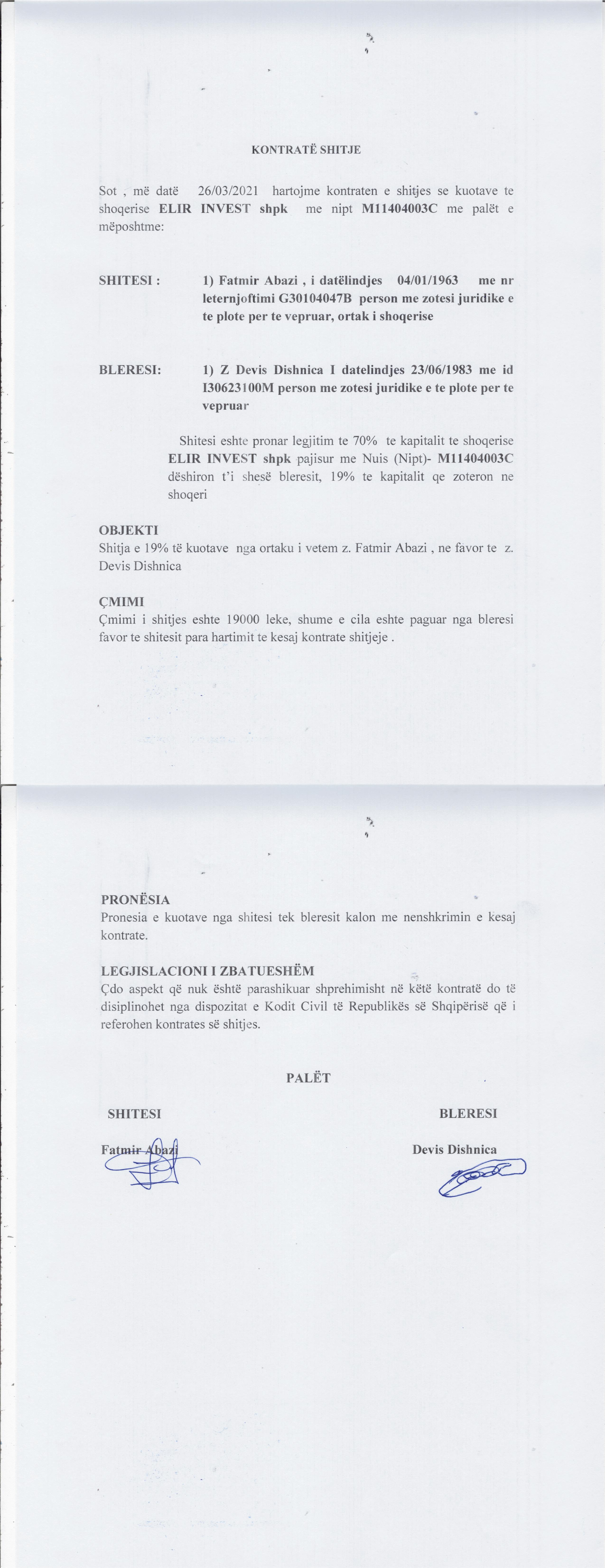 → Ekstrakt Historik i Regjistrit Tregtar date 19.09.2022 → Akt themelimi dhe Statuti i Shoqerise → Kontrate Shitje Kuotash date 26.03.2021 |