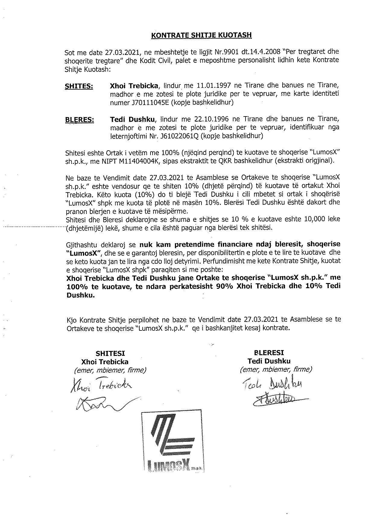 → Ekstrakt Historik i Regjistrit Tregtar, date 22/9/2021 → Kontrate Shitje Kuotash 27.03.2021 |
