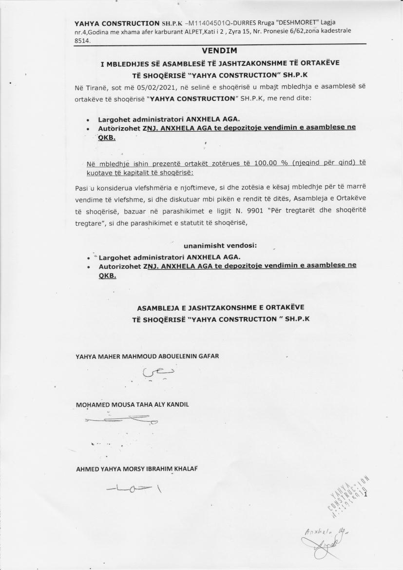 → Ekstrakt Historik i Regjistrit Tregtar, date 22.9.2021 → Akt themelimi, date 01.02.2021 → Vendimi i asamblese, date 05.02.2021 |