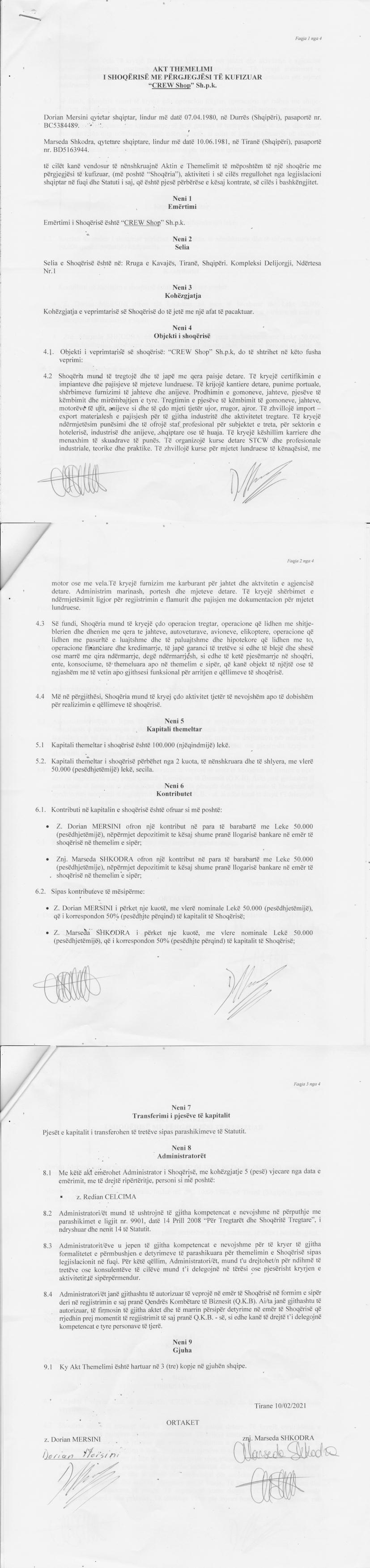→ Ekstrakt Historik i Regjistrit Tregtar, date 28/9/2021 → Akt themelimi , date 10.02.2021 → Vendimi i Ortakeve, date 01.06.2021 → Statuti i shoqerise, date 10.02.2021 |