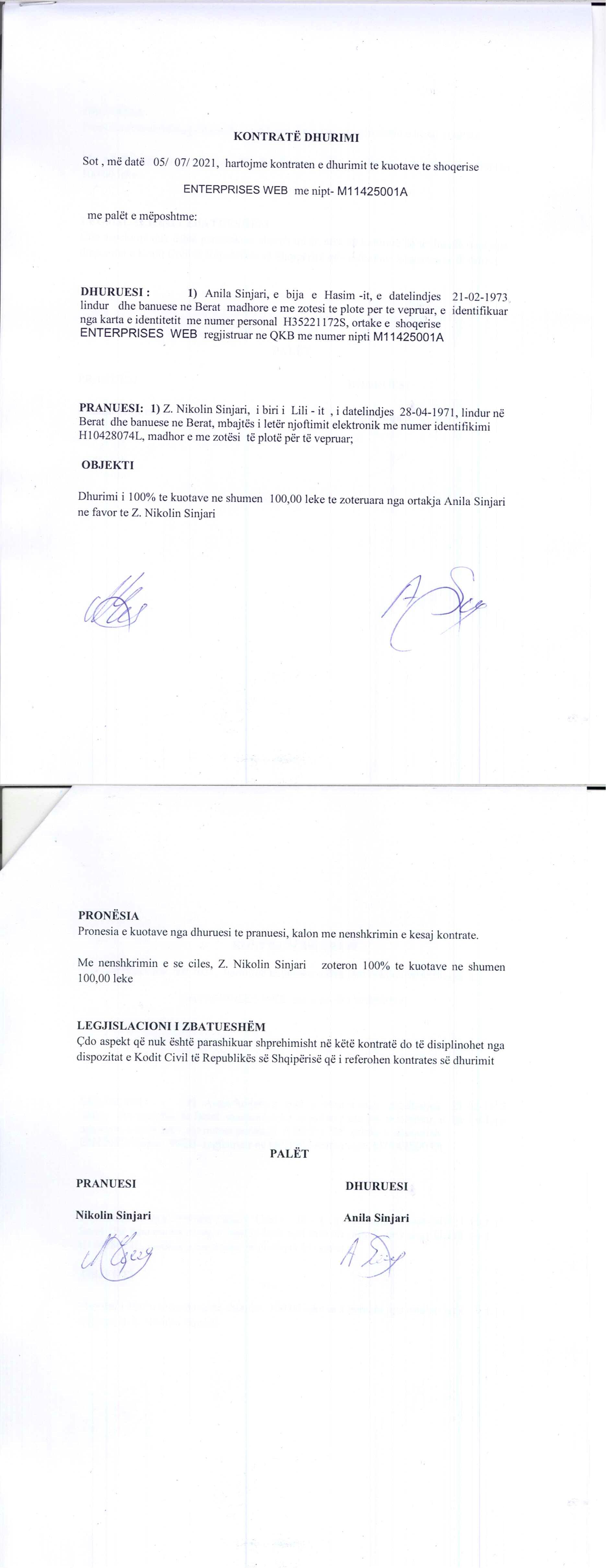 → Ekstrakt Historik i Regjistrit Tregtar, date 7.10.2021 → Statuti i shoqerise, date 23.02.2021 → Kontrata e dhurimit te kuotave, date 05.07.2021 → Vendimi i ortakut te vetem , date 05.07.2021 |