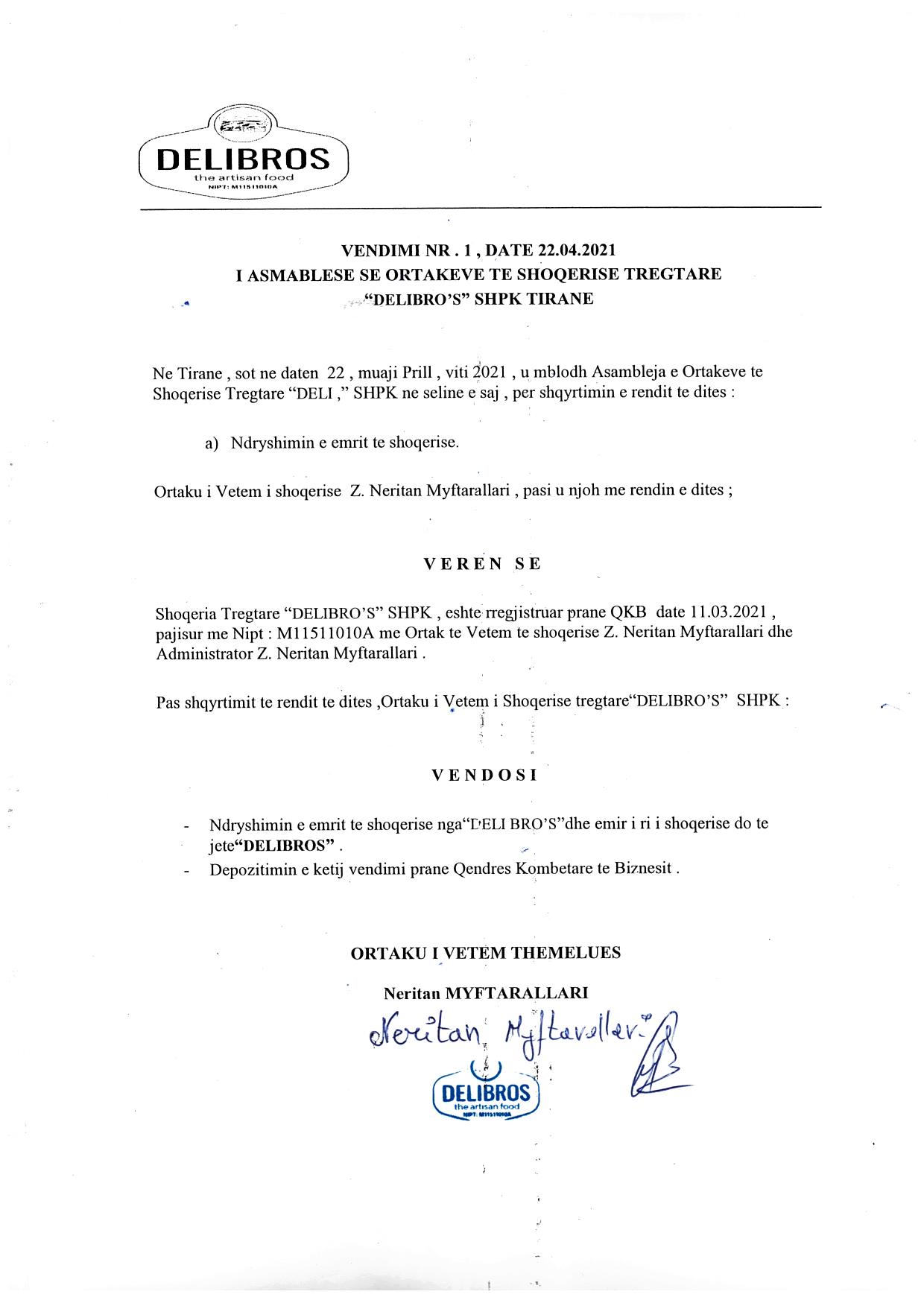 → Ekstrakt Historik i Regjistrit Tregtar, date 18.10.2021 → Statuti i shoqerise, date 10.03.2021 → Akt themelimi, date 10.03.2021 → Vendimi i asamblese, date 22.04.2021 |