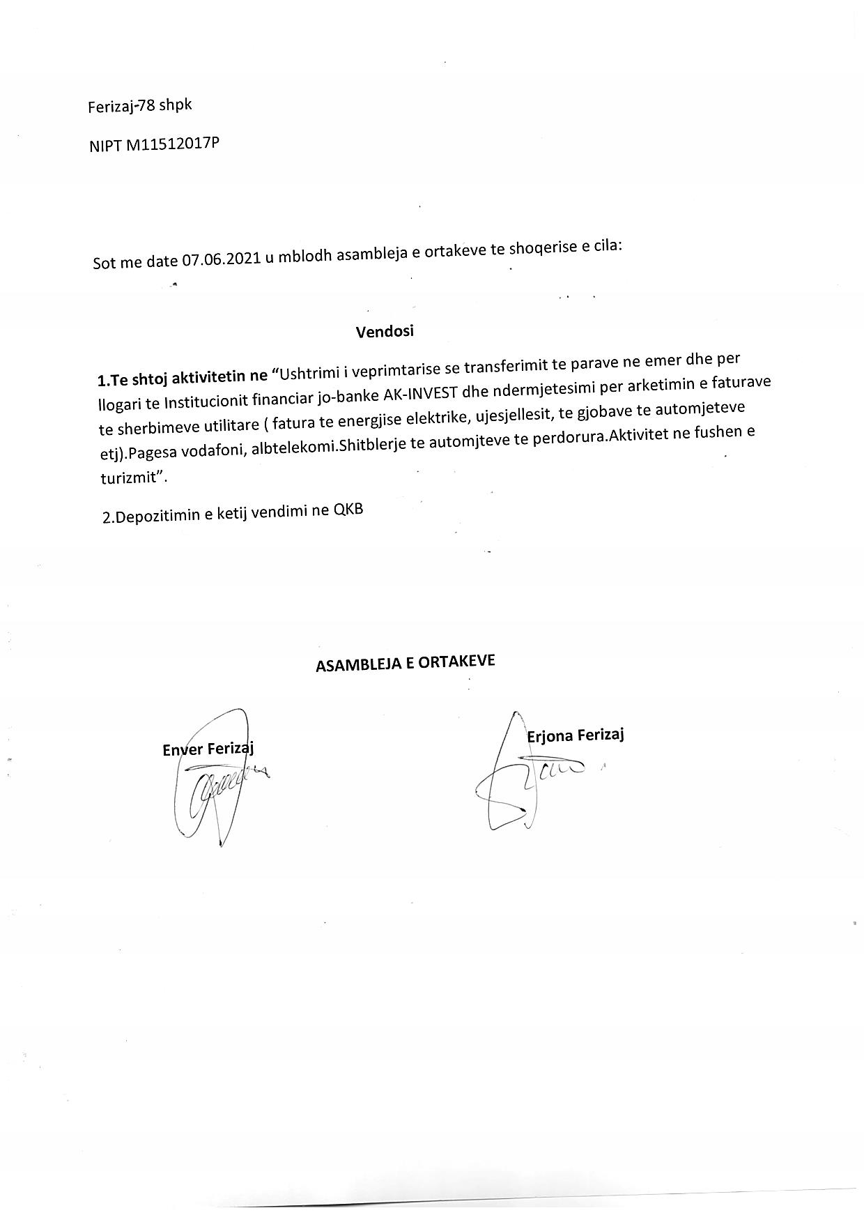 → Ekstrakt Historik i Regjistrit Tregtar, date 20.10.2021 → Statuti i shoqerise, date 10.03.2021 → Kontrate dhurimi i kuotave, date 26.03.2021 → Vendimi i Asamblese se Ortakeve, date 07.06.2021 |