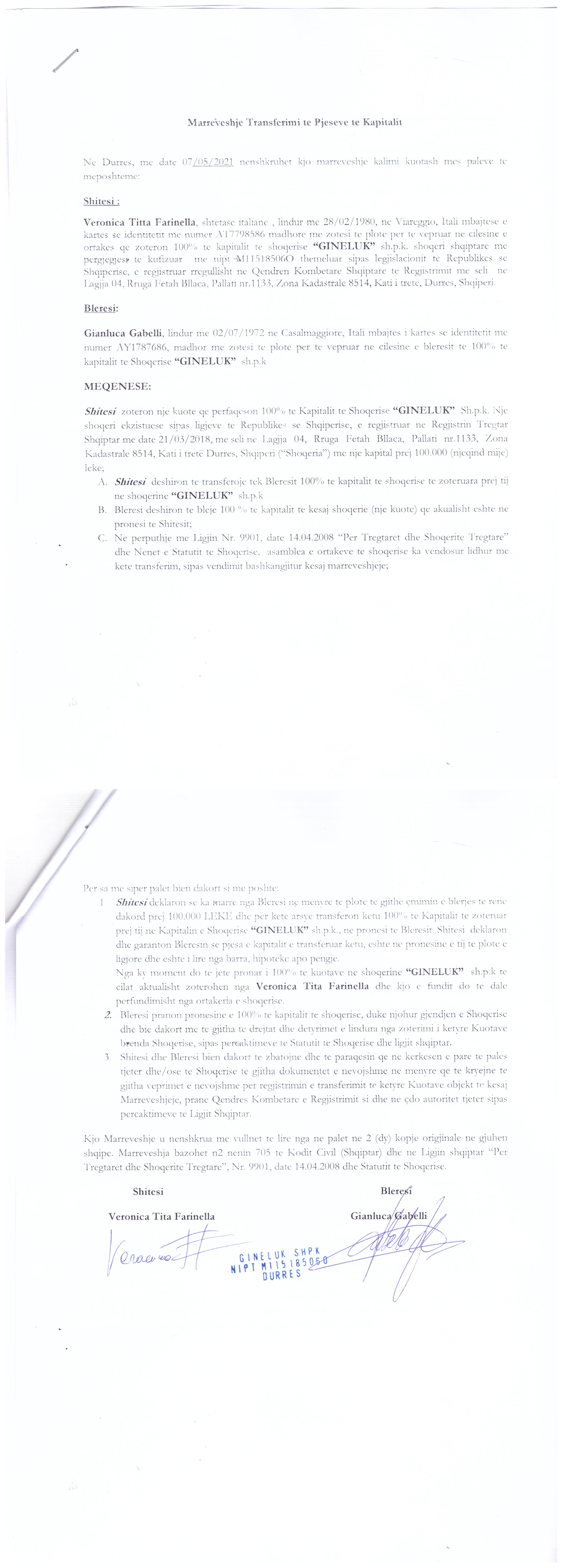 → Ekstrakt Historik i Regjistrit Tregtar, date 25.10.2021 → Akt themelimi, date 17.03.2021 → Kontrata shitjes kuotave, date 07.05.2021 → Vendimi i Asamblese se Ortakeve, date 07.05.2021 → Vendimi i ortakut te vetem, date 07.07.2021 |