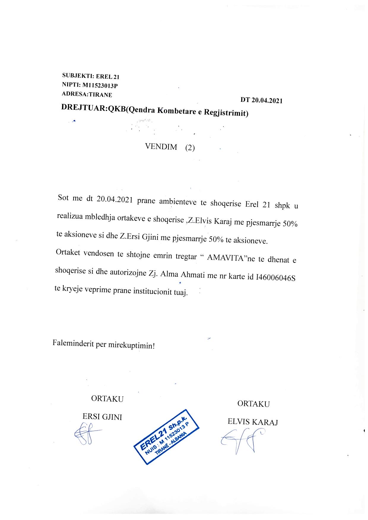 → Ekstrakt Historik i Regjistrit Tregtar, date 26.10.2021 → Statuti i shoqerise, date 16.03.2021 → Vendimi i Ortakevve, date 20.04.2021 |